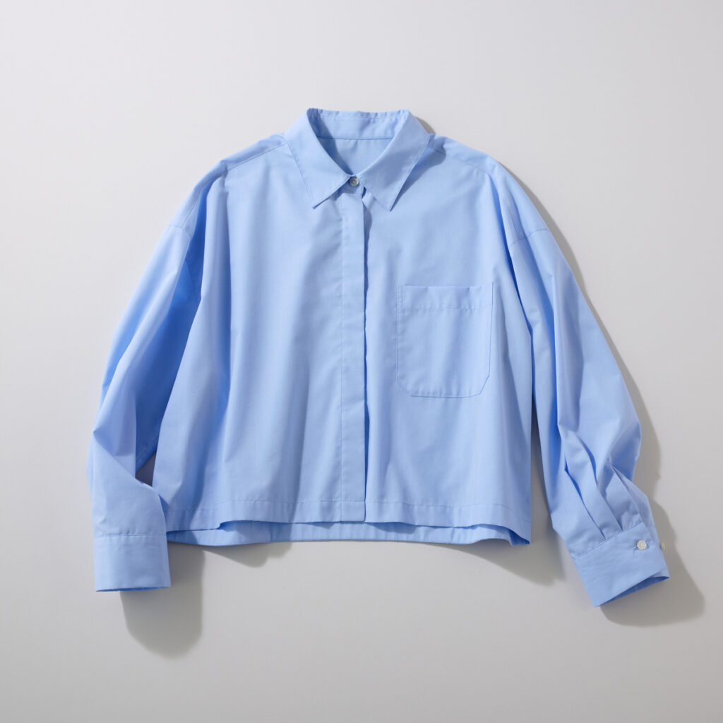 骨盤が隠れるくらいのすっきりとしたショート丈で、どんなボトムスも受けとめてくれる万能シャツ。程よいゆとり感があり、羽織りとしてもレイヤードスタイルとしても着回し可能。ハリのある素材に防シワ加工を施しているので、いつでもキレイをキープしてくれます。お手入れも簡単で、デイリーに着まわせる一着。
