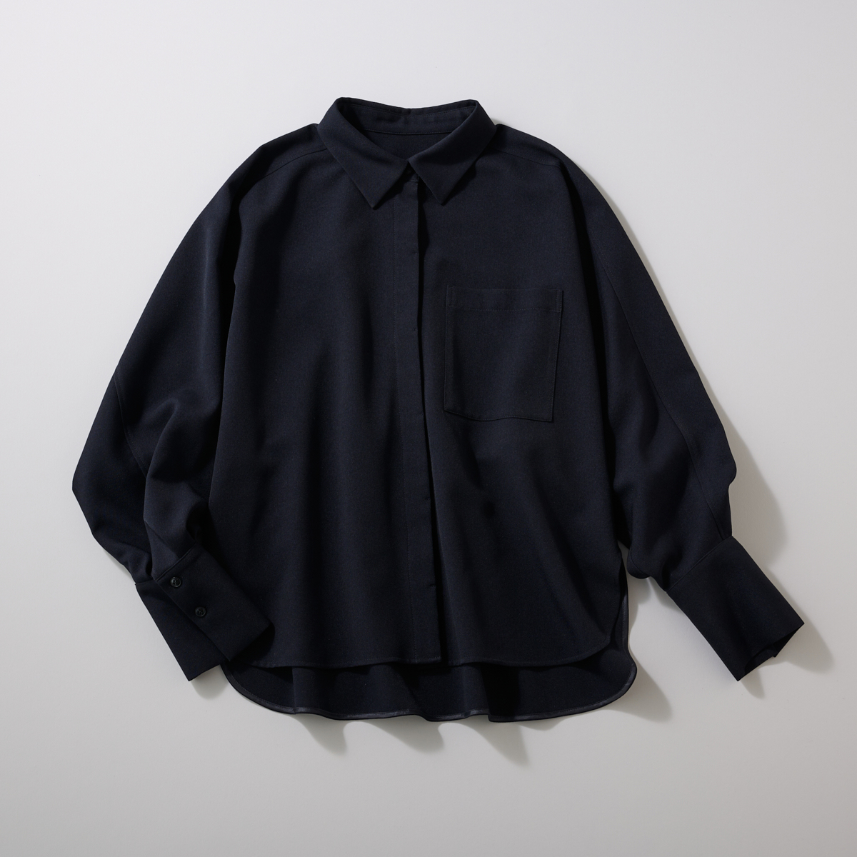 サラっとした質感と落ち感のあるツイル素材を使用した、ウールのような風合いが特徴。デザインを削ぎ落としたミニマルなドルマンスリーブシャツが、着るだけでモードな印象を演出します。袖口のタックやサイドスリッドなど、ボリューム感のあるデザインをスタイリッシュに見せるディティールも魅力。秋冬の通勤スタイルをスマートに格上げしてくれるはず。