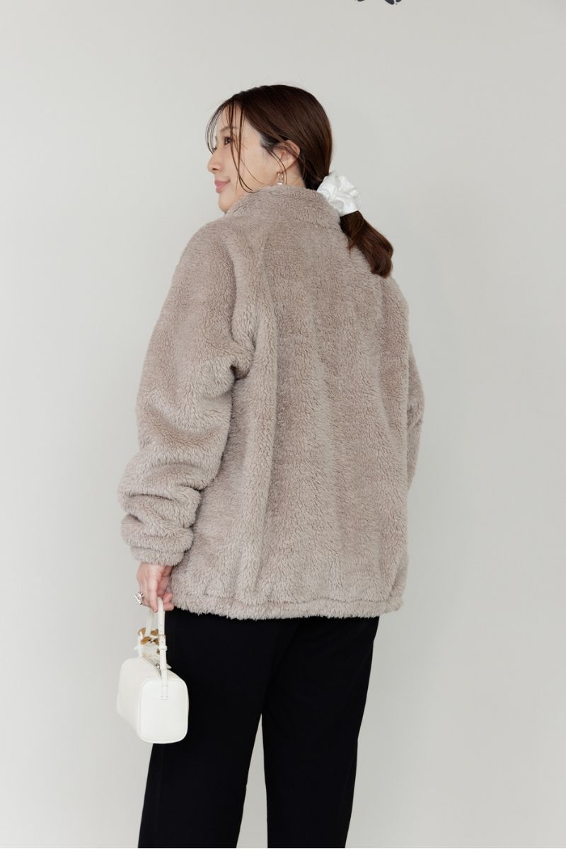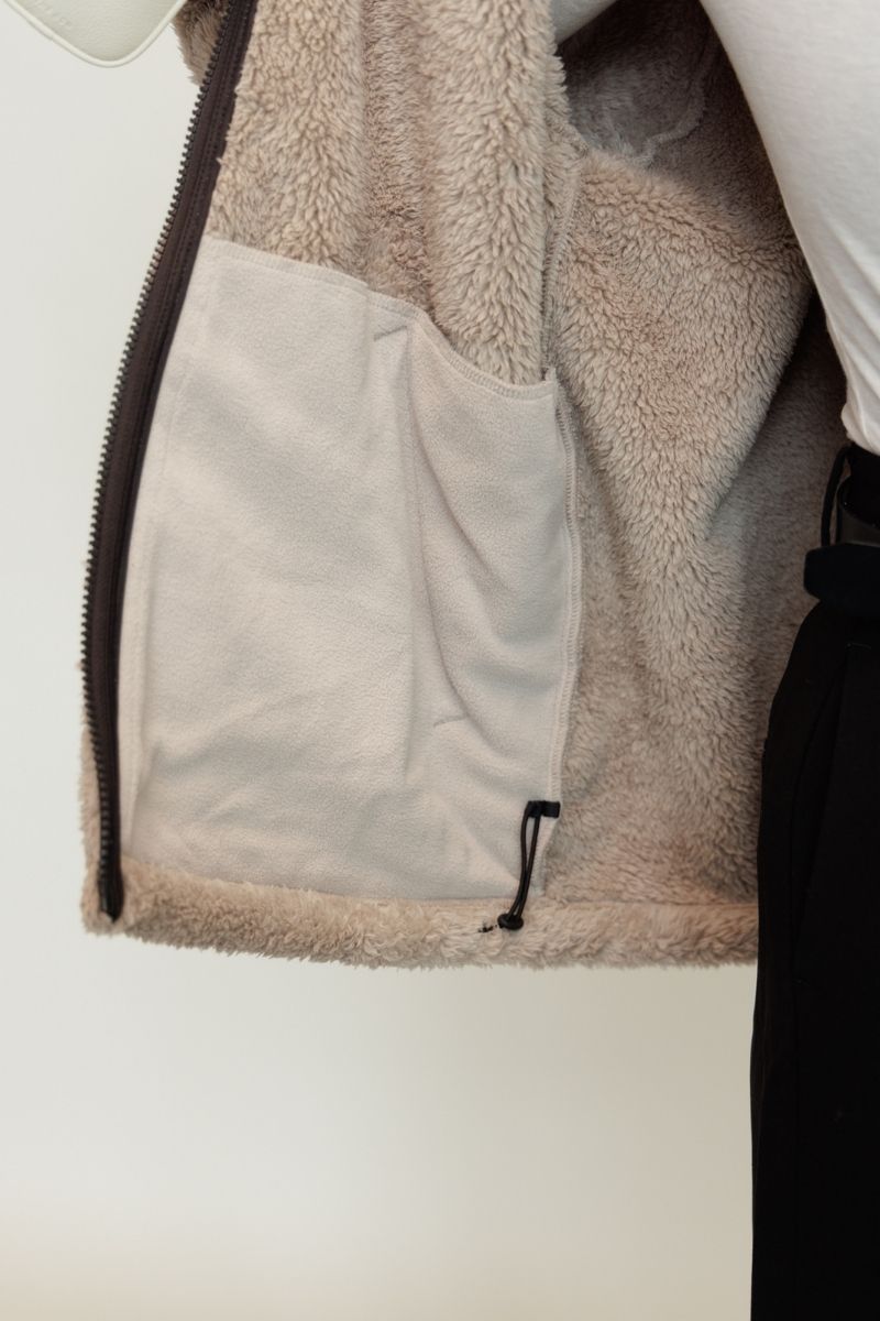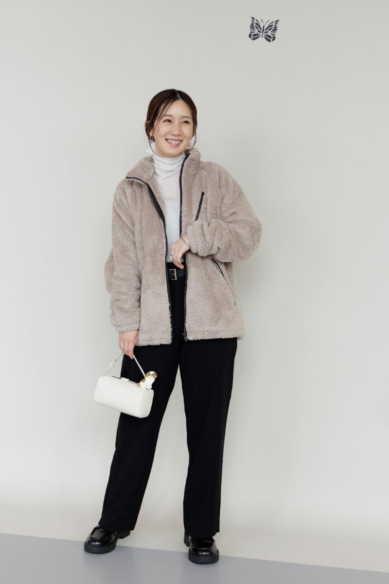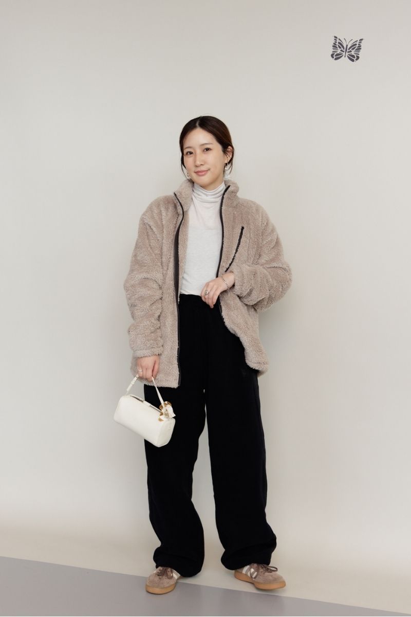 毛足が長くモコモコとしたフリースジャケットは、高見えするうえ軽くて暖かい! 今回着用しているのは男女兼用のLサイズで、ゆったりとしたシルエットがキュンポイント。裾のアジャスターをきゅっと絞って、ボリュームを出しても可愛いです。胸元のジップポケットは斜めに配されているので、ほっこりせずスタイリッシュな印象に。しかもポケットにはすべてジップが付いているのでものを落とす心配もありません。