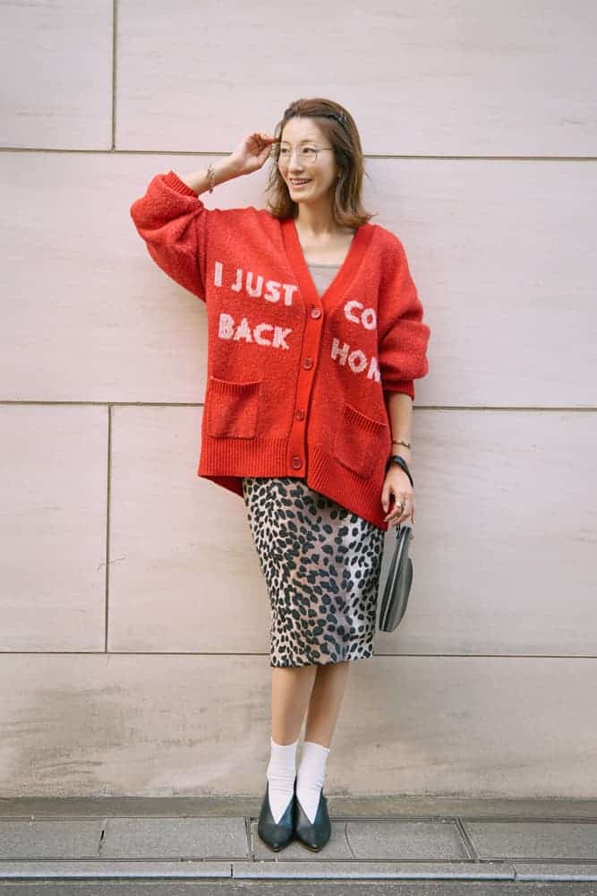 レオパード柄で【赤カーディガン】を今年顔にアップデート