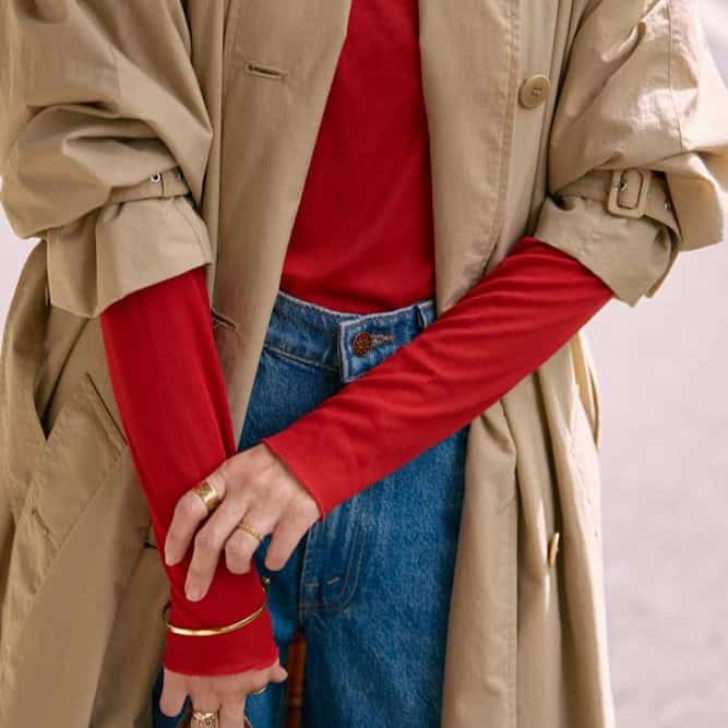 鮮やかな赤のトップスは、それだけで主役級の存在感。合わせるアイテムはクラシカルに、トレンチやローファーを合わせてトラッドにまとめるのが私流です。インパクトのある赤は、黒や白と合わせるとコントラストが強く出すぎてしまうことも…。ベージュやデニムのブルーなど、アースカラーを選ぶとぐっとこなれた印象に。トレンチから赤の見える分量を調節して、”差し色として楽しむ”大人のトラッドコーデに仕上げました。