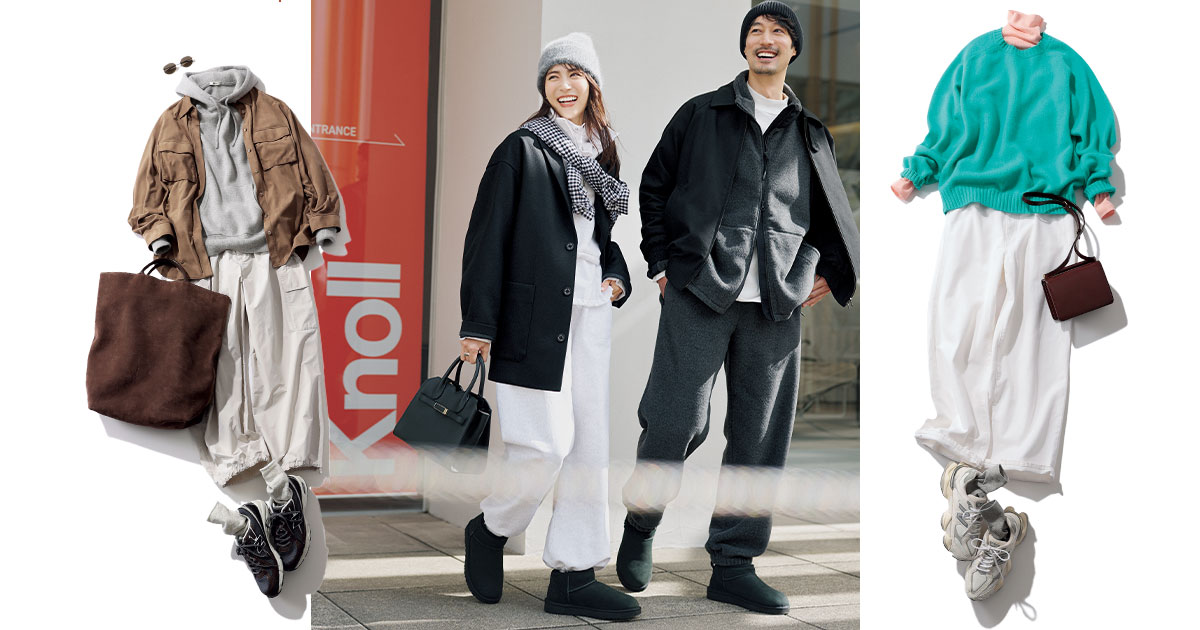 質感のコントラストで定番カーデ×パンツを新鮮に
