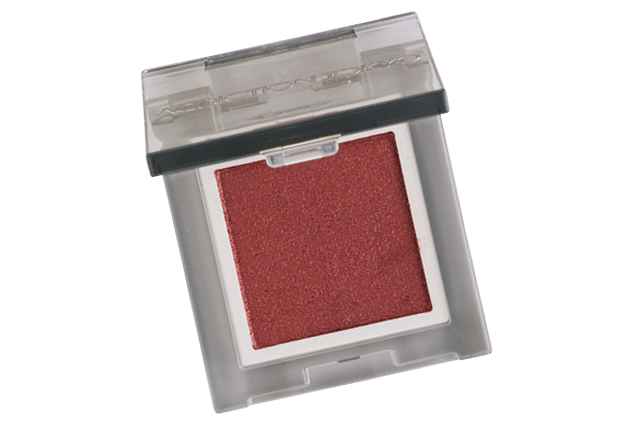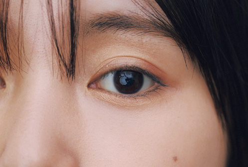 aの右上のベージュをアイホールと下まぶた全体に。上目尻にクランベリーレッドのbを点置きし、ふんわり繊細になじませる。にじむような赤が、眼差しに余韻を添える。