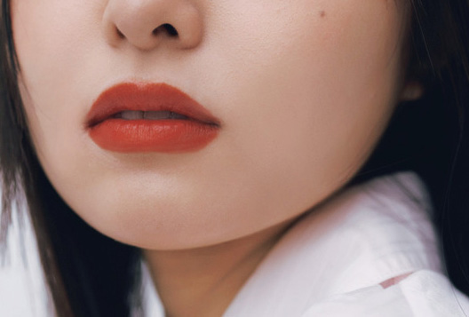 深みのある琥珀色のレンガカラーのdを、リップブラシで丁寧に唇全体に塗布する。さらにオレンジブラウンのeで唇全体の輪郭をふちどり、芯のあるワクワク感を演出して。