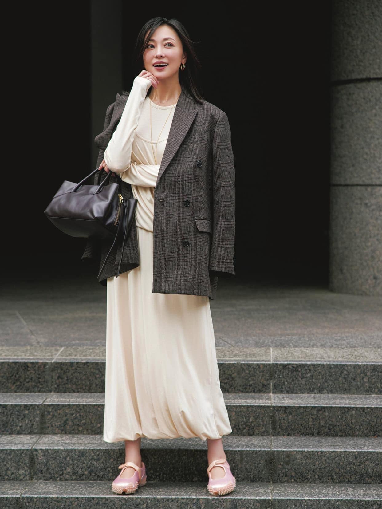 シューズ¥13,200(プーマ/プーマ お客様サービス)ジャケット¥25,300(マルゥ ユナイテッドアローズ/ユナイテッドアローズ カスタマーサービスデスク)ワンピース¥24,200(MIESROHE/MIESROHE ルミネ新宿1店)バッグ¥75,900(メアリ オル ターナ/AL Design Inc.)ピアス¥36,300(ブランイリス/ブランイリス トーキョー)ネックレス¥39,160(ソコ/ズットホリック)