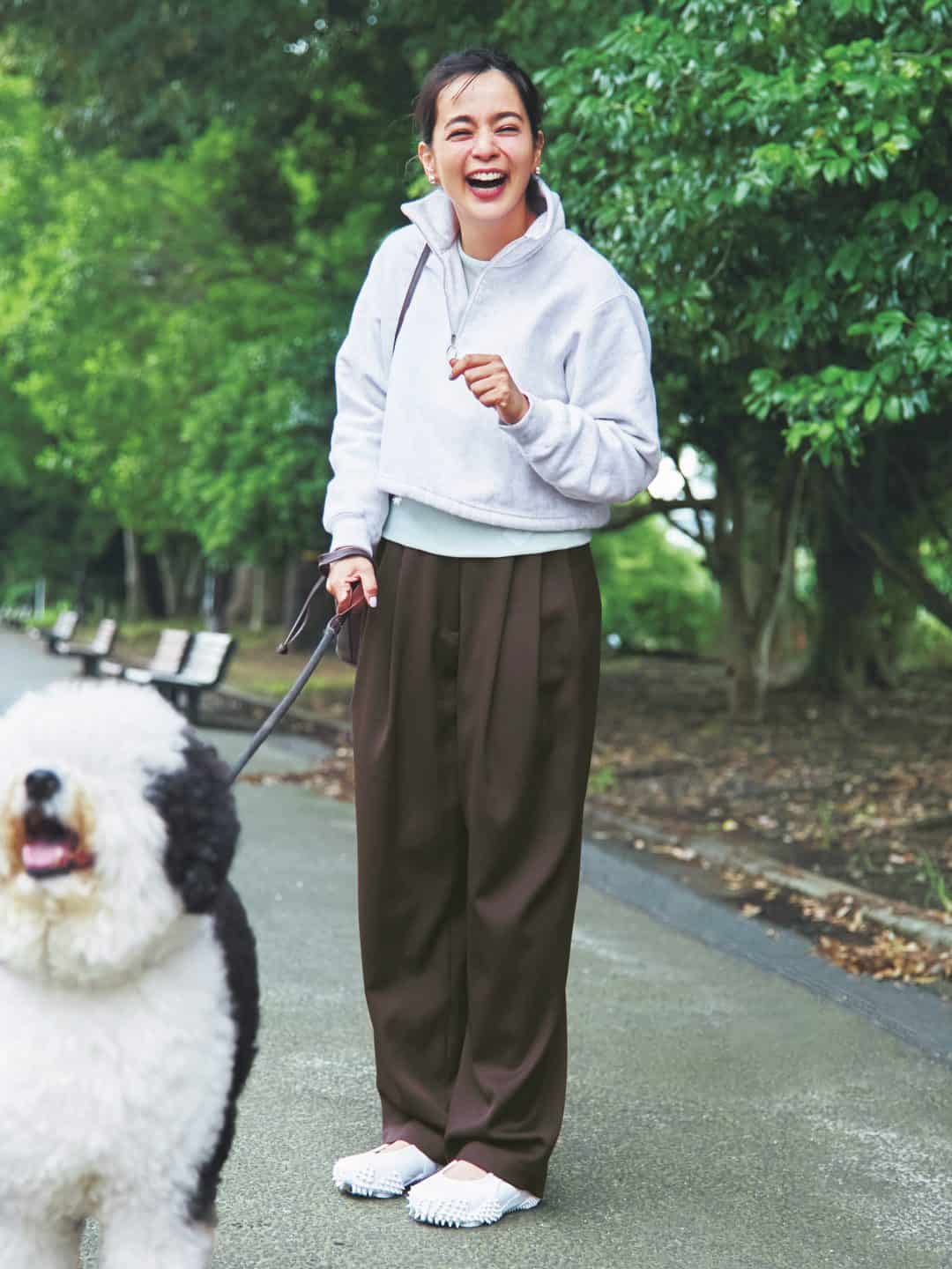 バレエシューズ¥12,650(ル タロン/ル タロン 有楽町マルイ店)ニット¥93,500パンツ¥58,300(ともにニアー ニッポン/ニアー)腰に巻いたデニムジャケット¥20,900(アルページュストーリー)メガネ¥42,900(プロポ/プロポデザイン)ピアス¥22,000ネックレス[長]¥101,640リング¥19,470〈すべてバルブス〉 ネックレス[短]¥33,000〈アルポ〉(すべてズットホリック)