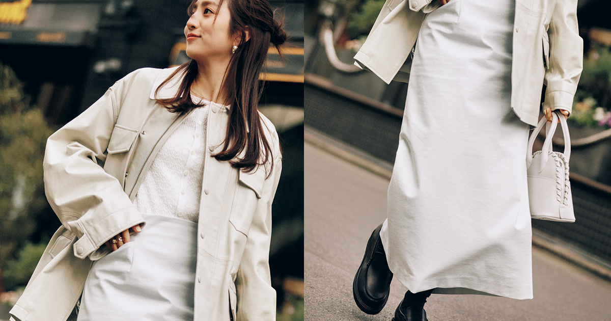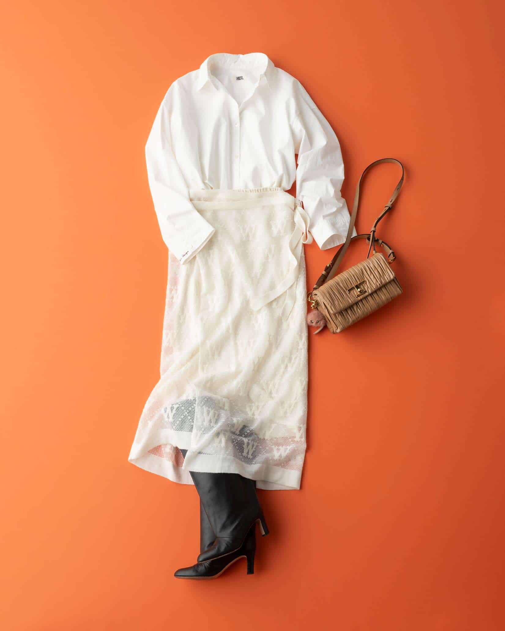 親友とディナーの日には夜の街でしっとり映えるオールホワイトコーデで出掛けます。巻きスカートはペチコートを合わせて1枚の白スカートとして着用。長めのブーツで足元の透け感を調整しています。パリッと仕立ての良いシャツを合わせてクリーンでノーブルな雰囲気に。