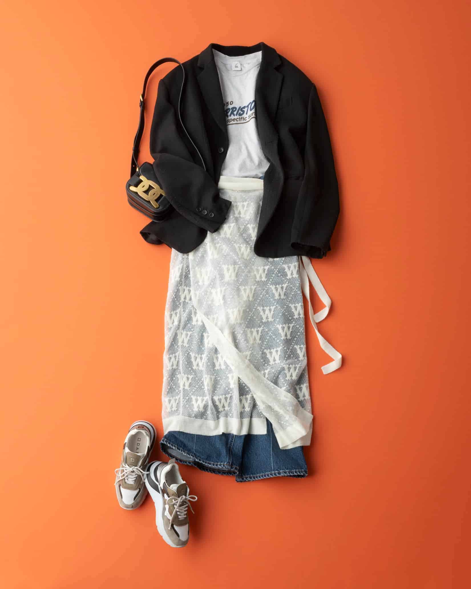 休みの日には行きつけショップをハシゴして街歩きを楽しみたい。そんな日にはやっぱり落ち着く定番のジャケット×デニムコーデで出掛けます。巻きスカートをデニムに乗せるとたちまち鮮度アップ!程よい透け感で甘さも感じられる大人カジュアルが完成します。