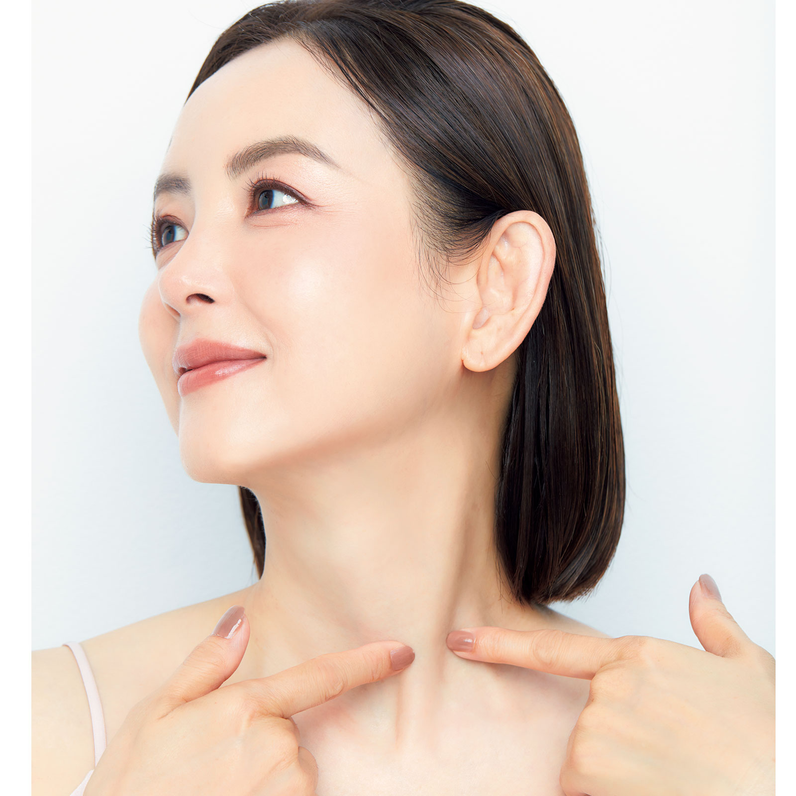 たるみ改善の鍵となるのが胸鎖乳突筋。顔筋膜リフト・セルフケアトレーナーの佐藤由美子さんいわく「胸鎖乳突筋の深部に静脈とリンパ節があるので、ここをほぐすと老廃物の排出が促され、輪郭たるみの解消に。頰のハリも生まれます。耳の後ろの胸鎖乳突筋停止部をグッと摑み、イタ気持ちいいくらいにほぐすのがコツ」。