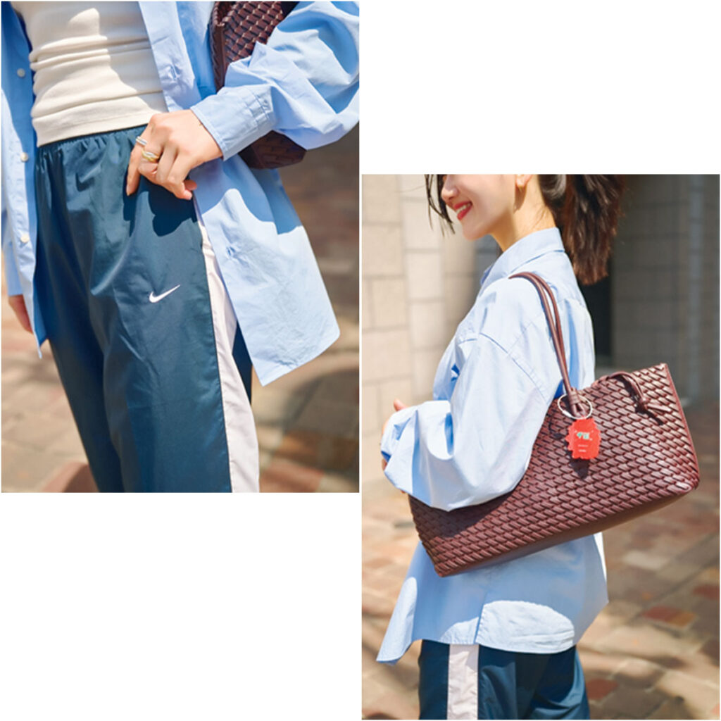 仕事終わりに友達とサウナ、からの夜お茶が最近の息抜き。着替えとして用意したナイキのナイロンパンツはバッグに入れてもかさばらないので機能的。トップスとシャツは通勤服をそのままシフトして、スポーツMIXを楽しんでいます。足元はマノロのヒールで女っぽさをプラス。ザラのカゴバッグは軽くて丈夫だから、サウナの荷物も余裕で入ります。
