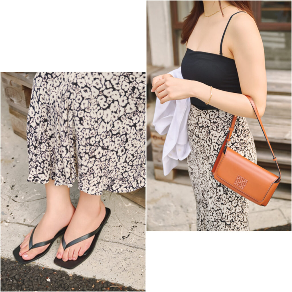 リラックスモードはありつつ、きちんと見えサンダルは譲れない。そんなCLASSY.世代のご近所サンダルは、ライニングやヒールのワンポイントデザインに特徴のあるシューズ。カフェの机から、ちらっとのぞく足元が気分を上げてくれる♡