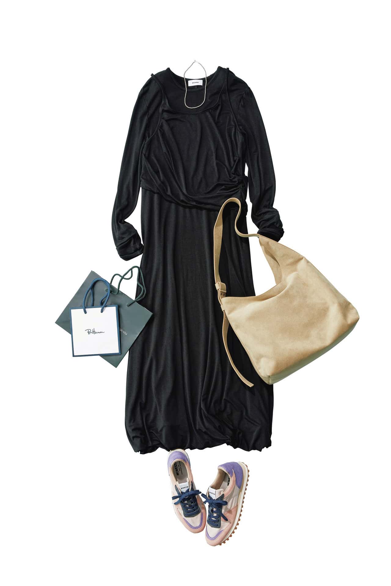 ワンピース¥24,200(MIESROHE/MIESROHE ルミネ新宿1店)バッグ¥39,600(ドゥーブル/ジュンカスタマーセンター)スニーカー¥27,500(ノヴェスタ/ノヴェスタ ジャパン)ネックレス¥13,200(vihod/ロードス
