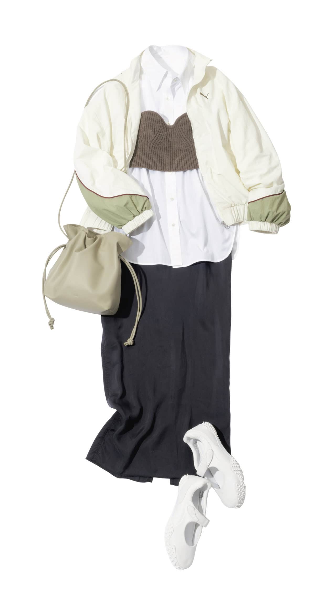 ナイロンジャケット¥9,900スニーカー¥15,400(ともにプーマ/プーマ お客様サービス)シャツ¥49,500(エステータ/オンワード樫山 お客様相談室)ビスチェ¥27,500(フィーニー)スカート¥33,000(イレーヴ)バッグ¥45,100(ヴァジック/ヴァジックジャパン)
