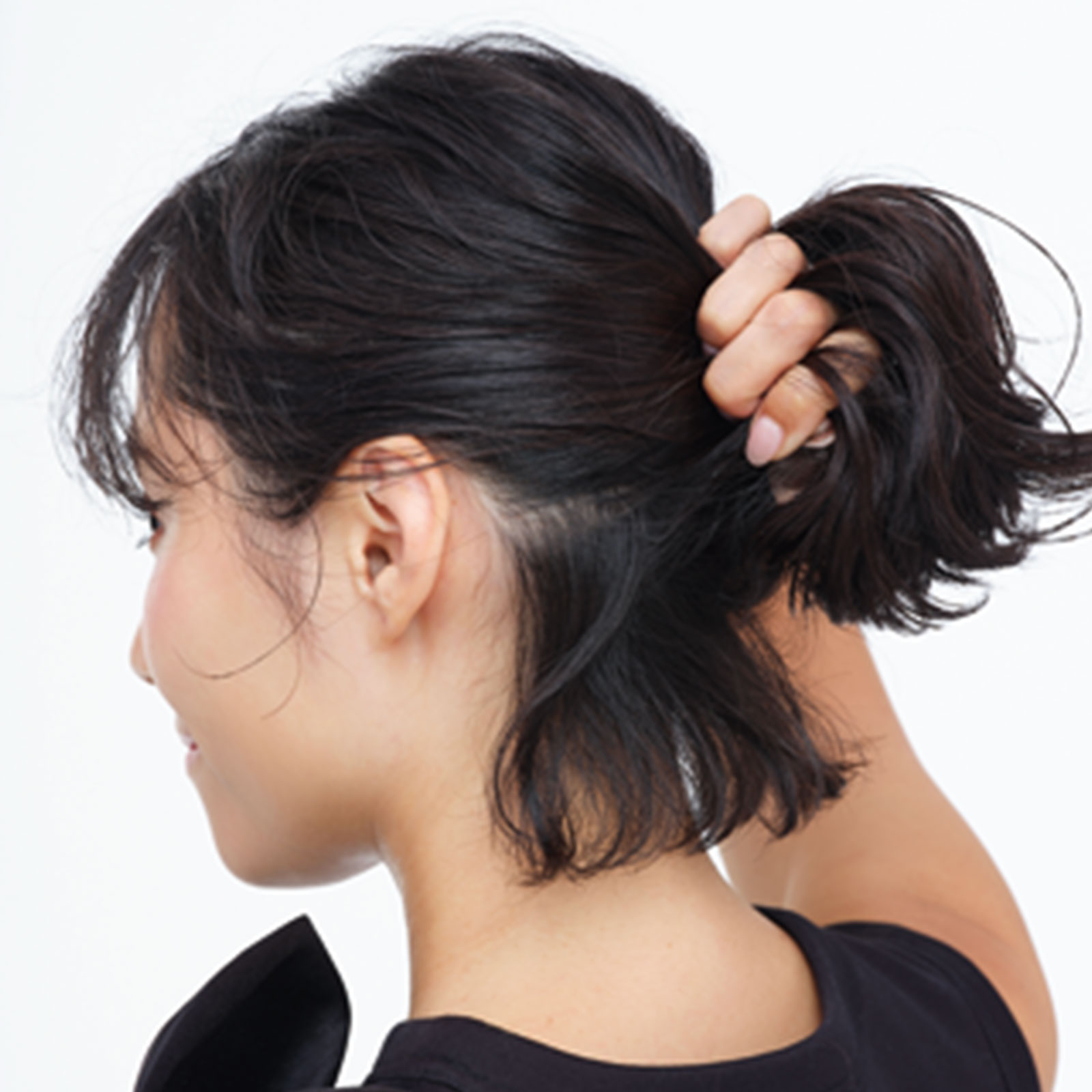 1.オイルを全体につけ、耳下の位置でゆるくまとめる。