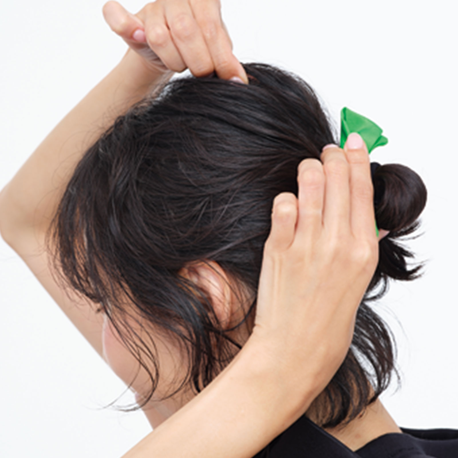 4.毛先をゴムで仮留めし、リボン付きゴムで結び目を隠せば完成。