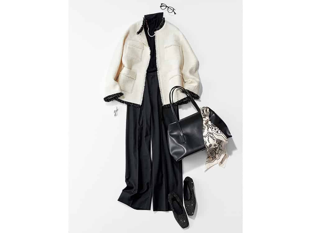信頼感も華やかさも両得! ALL黒に重ねるだけで、凛とした印象を与える白ツイードで仕事もオシャレも〝デキる人〟。