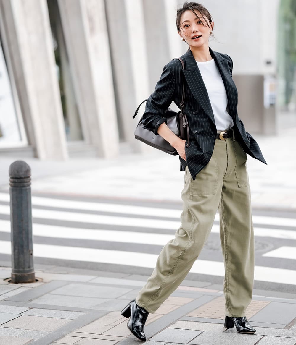 お堅すぎないコーデが今どき。トレンドに左右されないピンストライプの黒ジャケットは、合理的思考の最適解。
