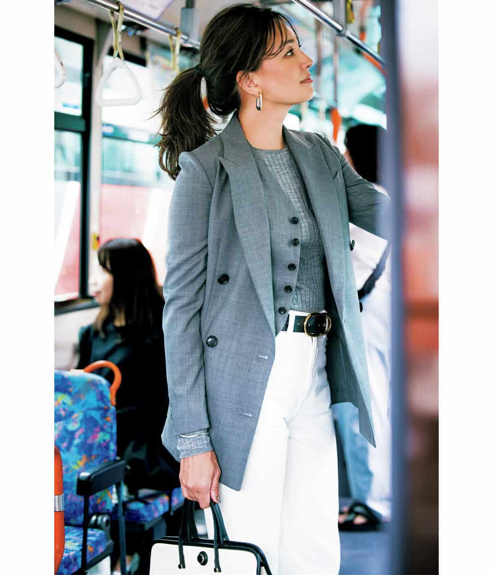 ジャケット ¥173,800ベスト¥77,000デニムパンツ¥52,800(すべてマディソンブルー)ニット ¥34,200(テラ/ティースクエア プレスルーム)ベルト ¥29,700(アロー)バ ッ グ ¥26,400(SOMEWHERE STUDIO/エルディスト ショールーム)ピアス ¥2,310(スリーフォータイム/ジオン商事)バングル ¥36,300(エムシー・スタジオ/ ZUTTOHOLIC)