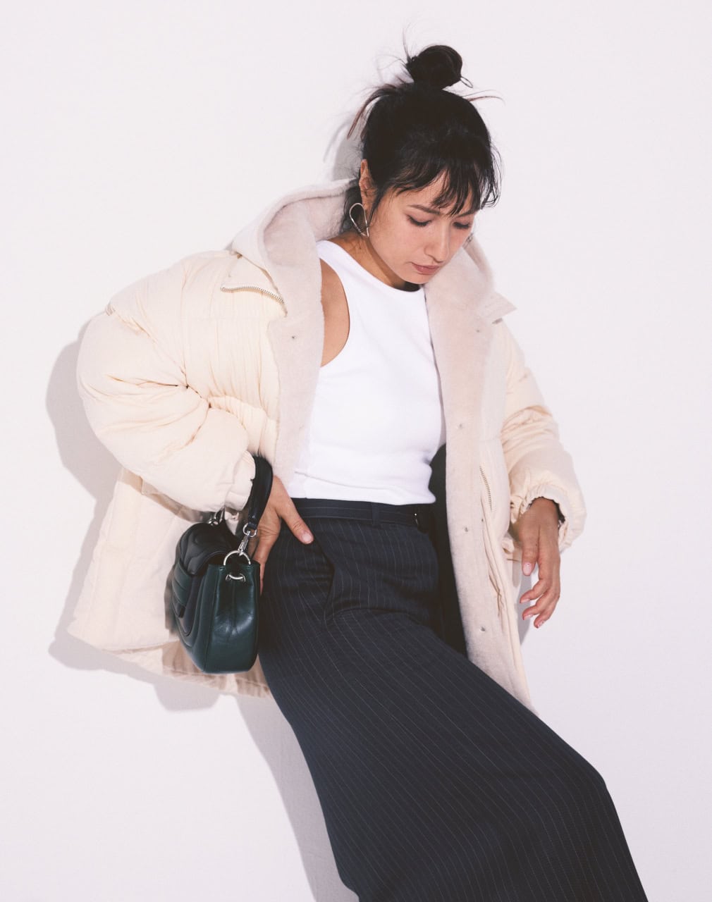 ベスト¥42,900 ニット¥26,400 パンツ¥37,400(すべてアナイ) ポシェット¥75,900(マエス トソ/ハウス オブ ロータス) トートバッグ¥62,700(アヴァケーション/アルアバイル) スニーカー¥24,200(ニューバランス/ニューバランスジャパンお客様相談室) シングルピアス各¥14,850 イヤーカフ¥19,800 ネックレス¥74,800 ブレスレット¥31,900 リング¥27,500(すべてラムダ)[ベビー]ブラウス¥10,450 スカート¥10,450 カーディガン¥9,350 ぬいぐるみ¥4,950(すべてマールマール) スニーカー¥7,920(ニューバランス/ニューバランスジャパンお客様相談室) ソックス/スタイリスト私物、ベビーカー〈JOOLZ AER2〉 サンデートープ¥85,800(ジュールズ/GMP インターナショナル)