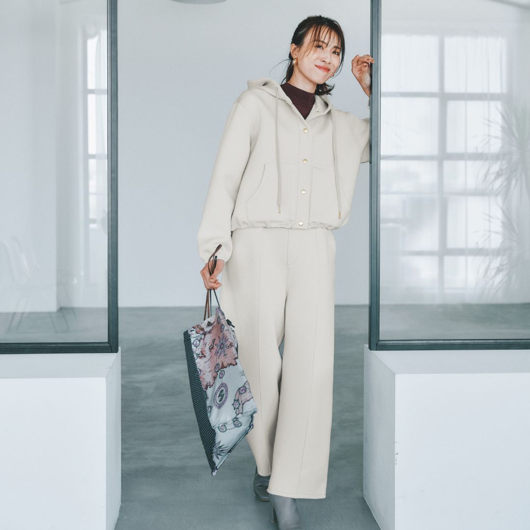 【フーディジャケット】は上下セットでキレイめ!白のワントーンが華やぐ