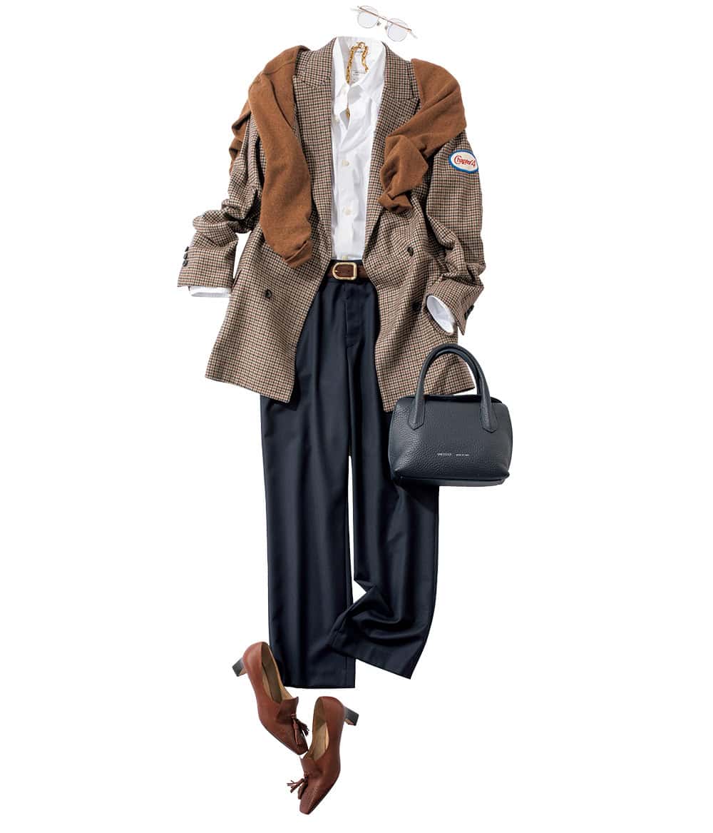 チェックジャケット¥170,500(マディソンブルー)シャツ¥59,400パンツ¥79,200(ともにマディソンブルー)肩掛けにしたニット¥74,800(リア/エリオポール代官山)ベルト¥44,000(デハンシェ/ユナイテッドアローズ 六本木ヒルズ店)バッグ¥73,700(イアクッチ/イアクッチ 大丸東京店)パンプス¥31,900(ヨシト/ニューロンドン)メガネ¥61,600(アイヴァン 7285/アイヴァン 7285 トウキョウ)チェーンネックレス¥10,120(プチ・モーメント/ZUTTOHOLIC)