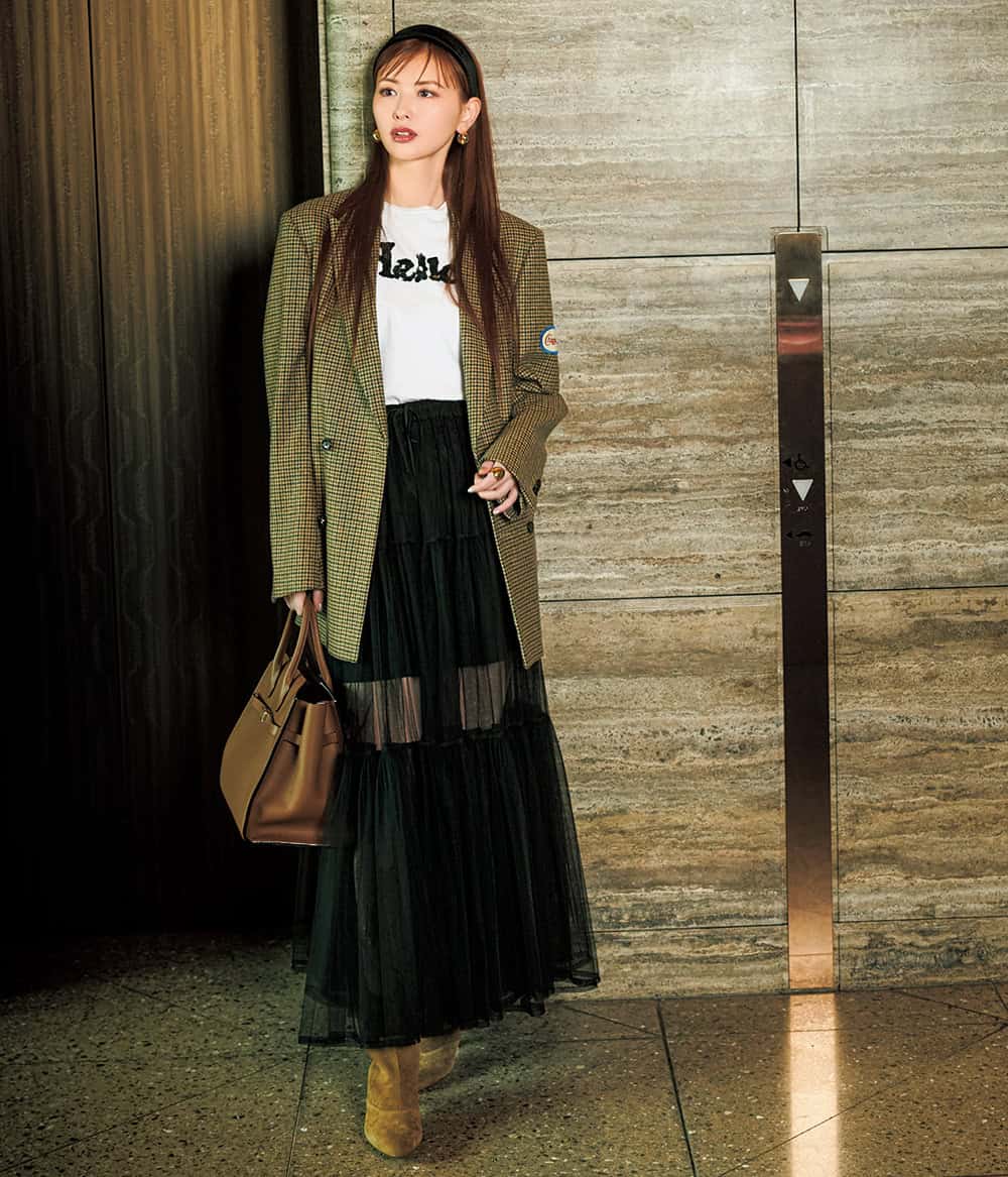 チェック柄ジャケット¥170,500 Tシャツ¥64,900(ともにマディソンブルー)チュールスカート¥28,000(シーニュ)バッグ¥781,000(ヴァレクストラ/ヴァレクストラ ジャパン)ブーツ¥48,400(ヨシト/ニューロンドン)カチューシャ¥14,300(ジェニファー オーレット/RHC ロンハーマン)ピアス¥8,690〈ピルグリム〉リング ¥34,980〈ともにソコ〉(すべてZUTTOHOLIC)