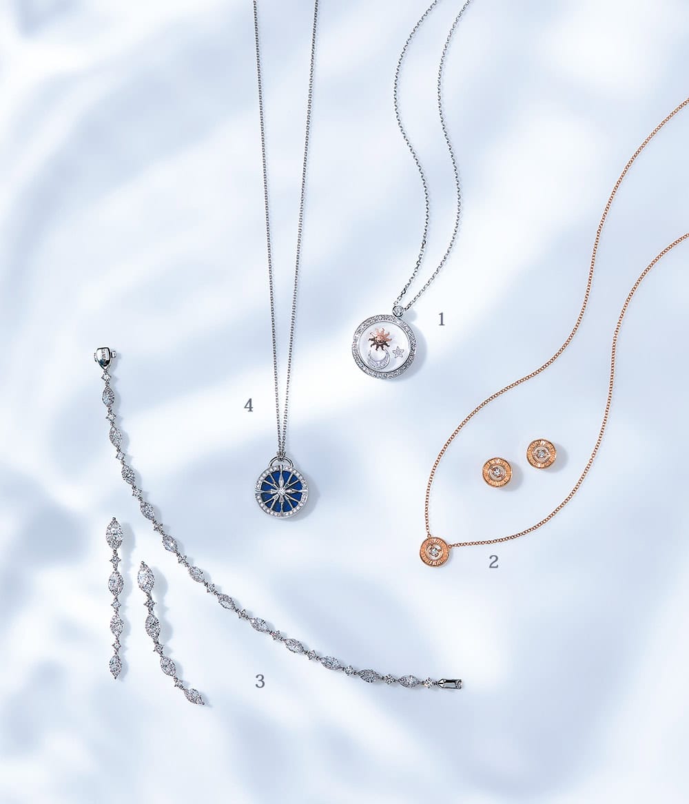 <物>ラウンド型のメダイユとクロスモチーフが、大切な人との永遠の愛や絆を連想させる。すべて「リアン」上から・ペンダント〈PG×DIA×ターコイズ〉¥427,900ペンダント〈YG×DIA〉¥1,683,000ブレスレット〈PG×DIA×MOP〉¥327,800(すべてショーメ)