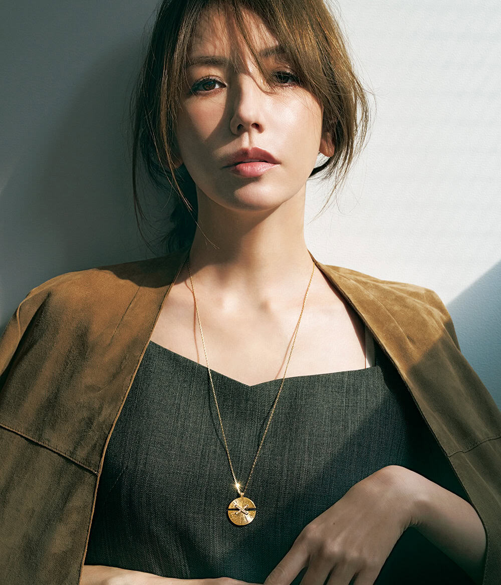 <人物>存在感のあるペンダントトップが、「胃」にかかるほど長いロングネックレスは、’26年上半期のラッキージュエリー。デイリーに愛用することで、格と自信が高まって、ジュエリーが似合う自分へ進化するはず。ペンダント「リアン」〈YG×DIA〉¥1,683,000(ショーメ)ワンピース¥26,400(ルーニィ)ジャケット¥148,500(コンテ/コンテ 青山店)
