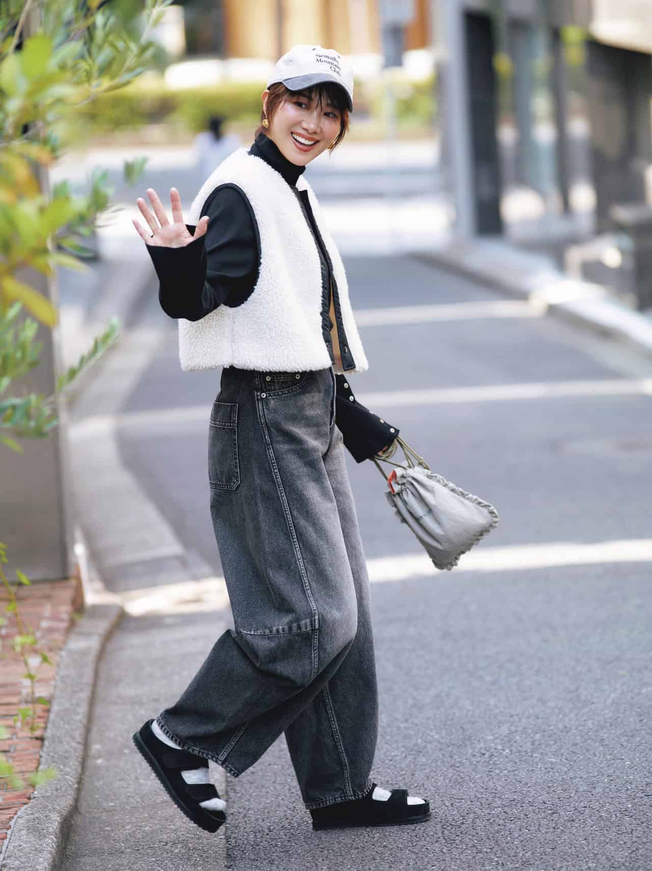 黒タートルは、スタイル全体を引き締めるクリーンな存在感が魅力。白のボアベストから黒をのぞかせることで首元がすっきり見え、コーデに立体感が生まれます。黒タートルは細見え効果が抜群で、短丈ベストによるスタイルアップを後押し。黒×白のコントラストが洗練された冬コーデにリズムと奥行きをプラスします。