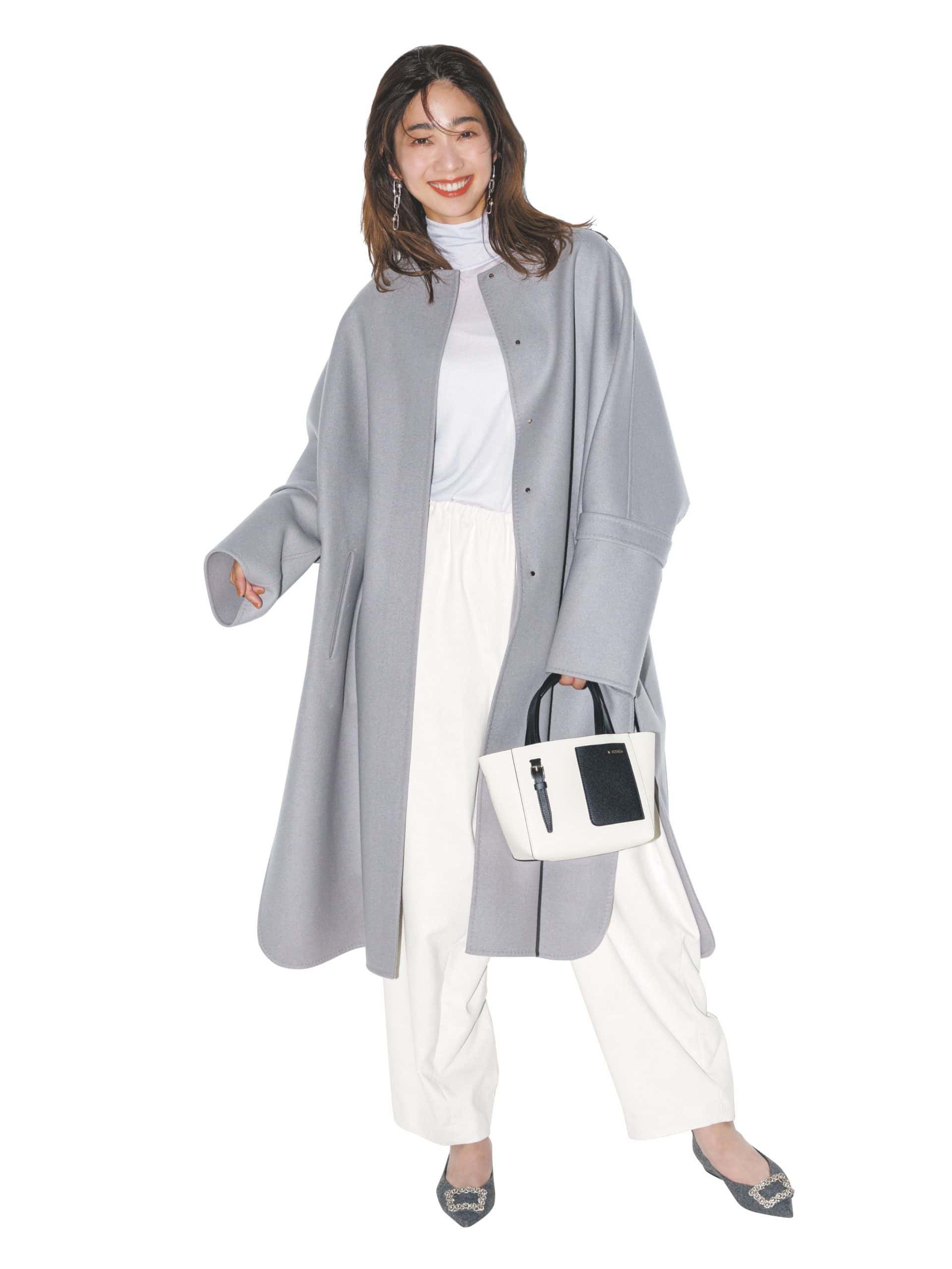 存在感たっぷりなロングコートは、体にフィットしすぎず、ゆったりしたシルエットの着用感が要。きれい色のグレーなどを選ぶと、抜け感がでて重さを回避してくれます。。ゆるーく温かく包み込みながら、体型を強調しないのがGOOD!