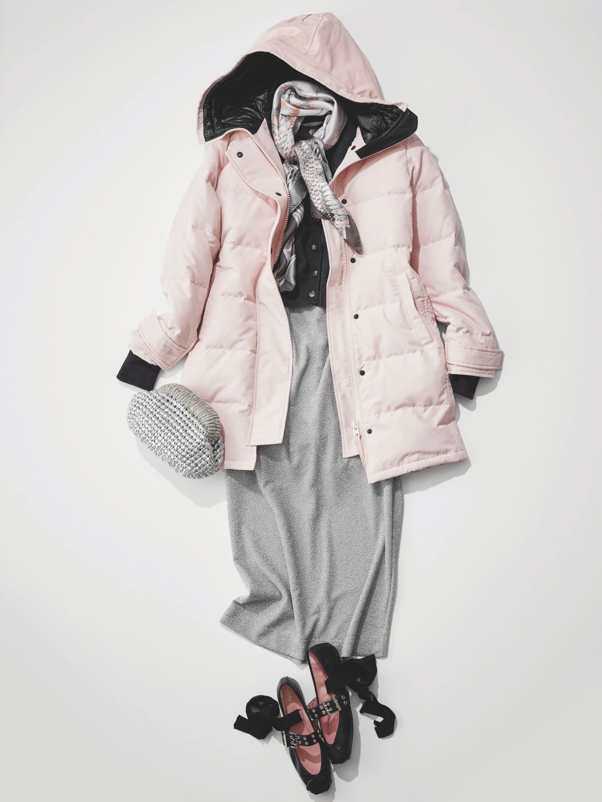 ピンクダウンコート¥242,000(カナダグース/カナダグースジャパン)ニット¥57,200(LOWER/ショールーム セッション)ラメスカート¥15,950(ジネス/ジオン商事)スカーフ¥22,000(マニプリ)バッグ¥55,000(ノアム ハザン/ティースクエア プレスルーム)シューズ¥60,500(プリティ・バレリーナ/F.E.N.)