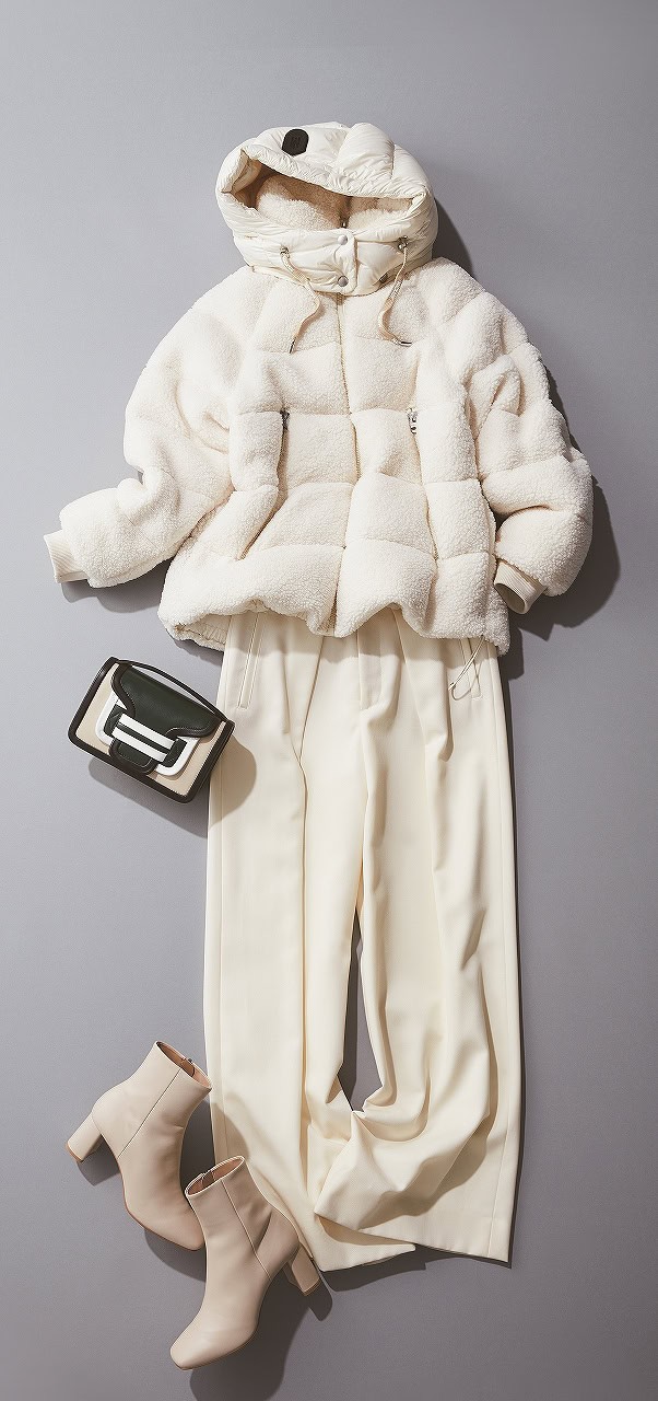華やぎのある白ダウンは、旅先でも普段使いでも大人のきちんと感をキープしてくれる強い味方。ナチュラルなボア×ダウン素材のW使いでトレンド感も防寒もバッチリな一枚です。冬のモノトーンに奥行きをプラスしてくれる名品コーデ。
