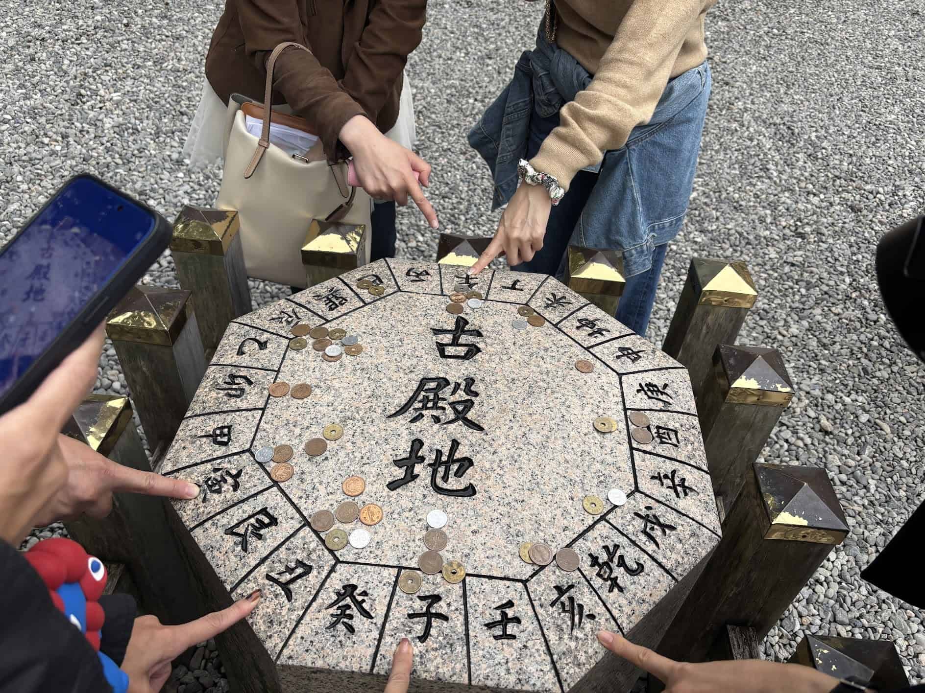 猿田彦神社境内の真ん中に、方位や干支が刻まれた八角の石柱があります。これは本殿が移される前に神殿があった場所で、自分の干支や関わりのある方角を触れると願いが叶うとか。ツアー参加したみんなで自分の干支に触ってみました。