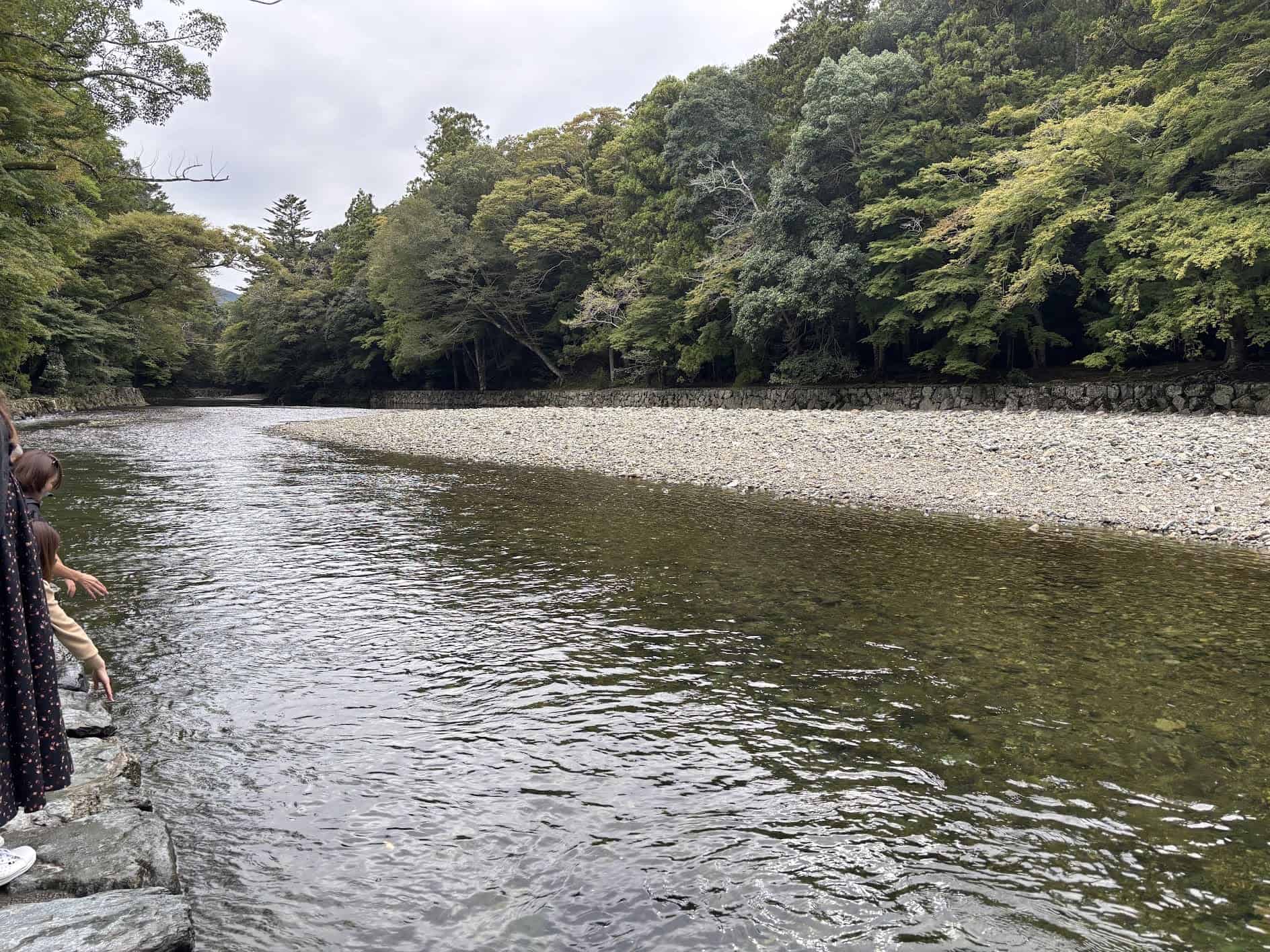 伊勢神宮の鳥居は非常にシンプル。伝統的に自然木が使われ、20年ごとに建て替えられる正殿の木材を再利用して作られています。この木の温もりを感じる佇まいがより神聖な雰囲気を感じさせますね。鳥居をくぐって、五十鈴川にかかる橋を渡ります。この五十鈴川は俗世と神域を分ける役割を持つ川で、川を渡ると空気が変わるのを感じられるはず。内宮参道右手の緩やかな斜面を降りていくと、石畳を敷き詰めたような手洗場が見えてきます。ここでは昔ながらに、五十鈴川の川の水で身も心も清めることができるのです。川の水は思ったよりも冷たくなく、手を清めて御正宮へと向かいました。