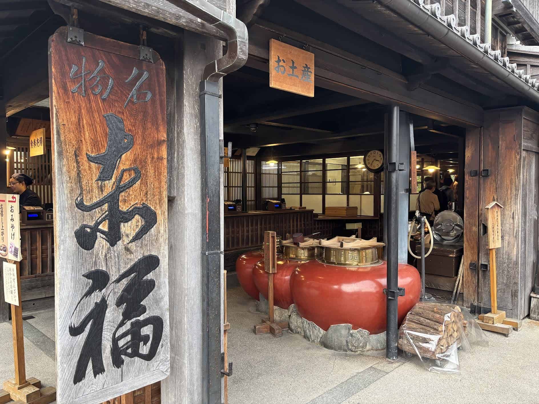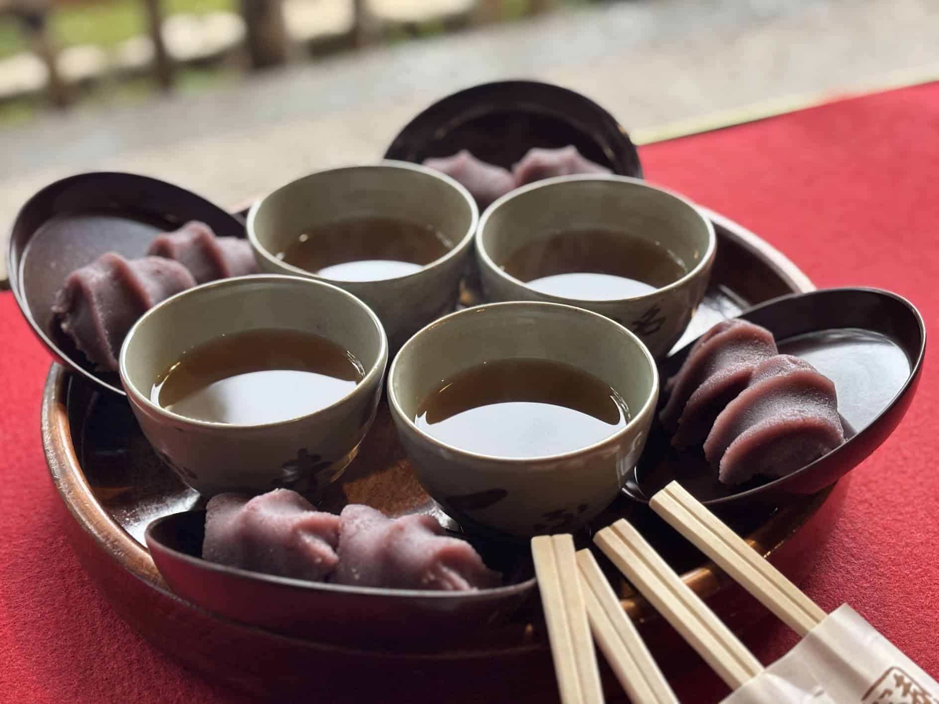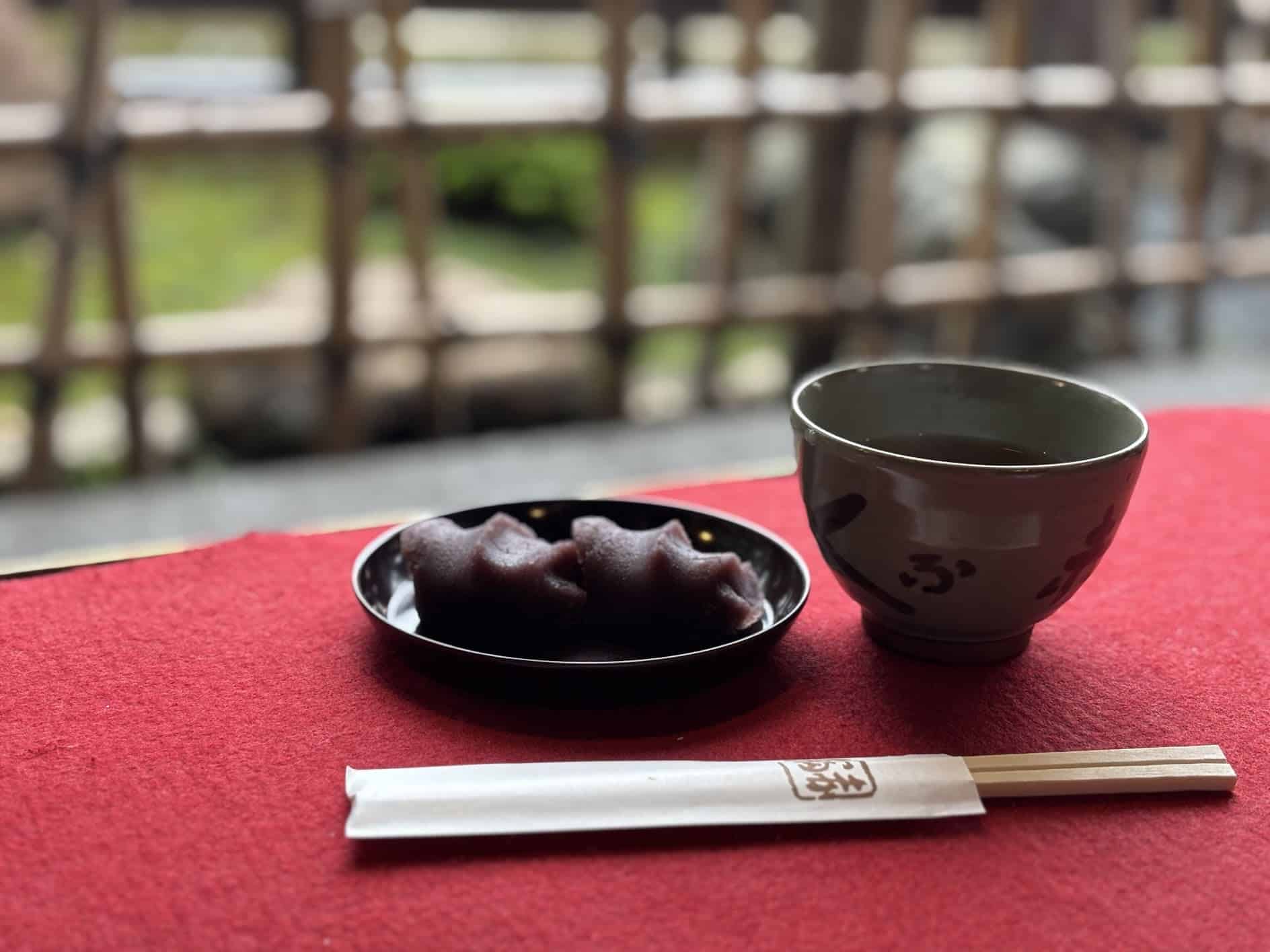 まだ時間があったのでおかげ横丁散策へ。赤福本店でお茶をしたいと思っていたのですが、前回訪れた時はゴールデンウイーク。長蛇の列で諦めた経緯があり、今回は叶うと良いなと思っていたら5人くらいしか並んでいなかったので、5分くらいですぐに順番が回ってきました。赤福餅2つにお茶がついて、なんと400円! 令和の時代になんて良心的な値段なのでしょう。店内は満席でしたが、座るところを探した途端に川沿いの赤絨毯の席が空いてすんなり座れました。
