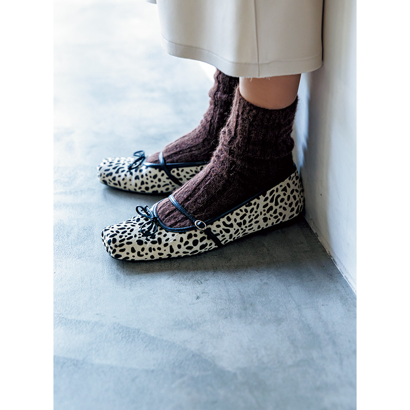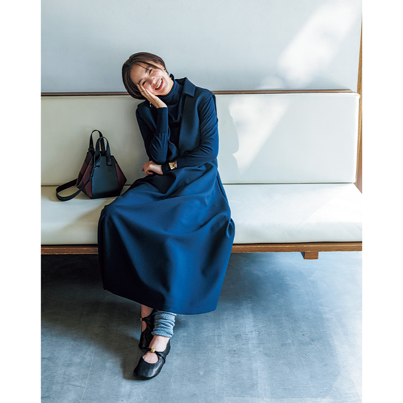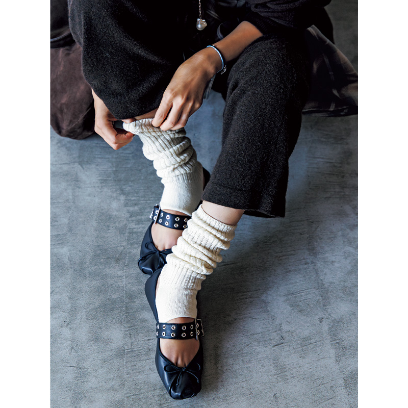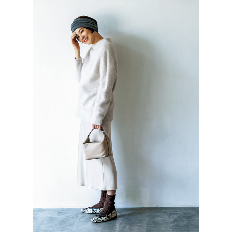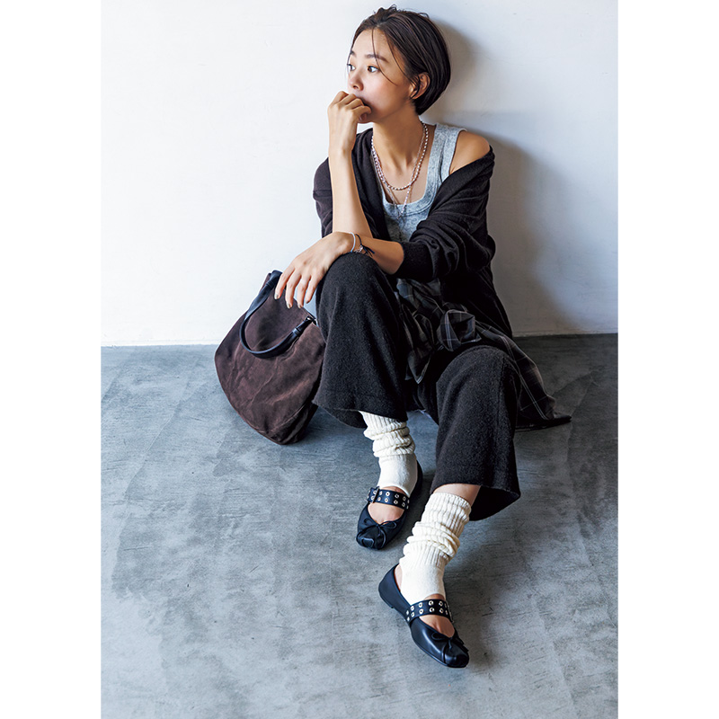 シューズ[ペブル ソフト バレリーナ]¥146,300バッグ¥455,400(ともにロエベ/ロエベ ジャパン クライアントサービス)レッグウォーマー¥1,540(靴下屋/タビオ)タートルニット¥66,000(エストネーション)ワンピース¥64,900(エブール/リトルリーグ インク)ピアス¥30,800〈モニス〉バングル¥11,550〈エイチアッシュ〉(ともにフォーティーン ショールーム)