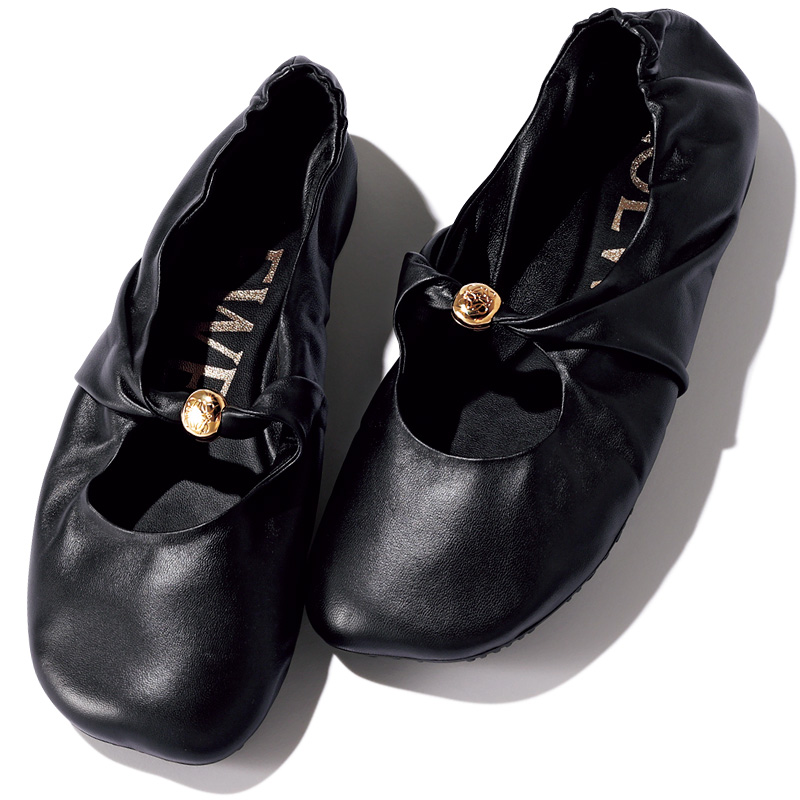 最高に柔らかいナパラムスキンを使用。ロエベのシグネチャーであるアナグラムが刻印されたメタリックペブルが、しなやかなレザーを繫ぎ合わせているようなモダンなバレエシューズは履き心地も高感度な見た目もマタニティフレンドリー。素足オシャレもきれいにきまる名品シューズ、レッグウォーマーをくしゅっと合わせるのも素敵!