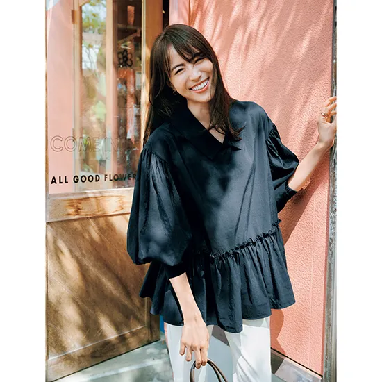 ジャケット¥39,600(アルページュストーリー)ブラウス¥26,950(スーペリアクローゼット/フランドルカスタマーサービス)パンツ¥29,700(styling//styling/ ルミネ新宿1店)バッグ¥1,145,100(デルヴォー)パンプス¥108,900(ジャンヴィト ロッシ/ジャンヴィト ロッシ ジャパン)ピアス¥8,800(ロニ)