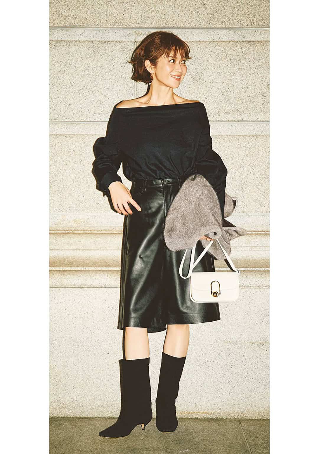 オフショルの肌見せも、黒レザーのハーフパンツなら甘さを引き締めて挑戦しやすい着こなしに。ロングブーツと色味を揃えて、潔くモードな印象。大人が無理なく着られる、攻めすぎない色気が漂います。