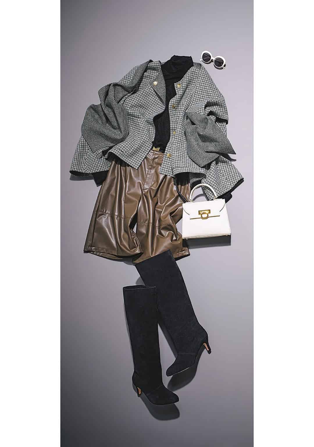 チェックのストール付きコート×レザーハーフパンツで旬顔に更新。色はシックにまとめて大人の品をキープ。ロングブーツで端正に仕上げれば、年末の集まりでも好印象な洒落感コーデに。