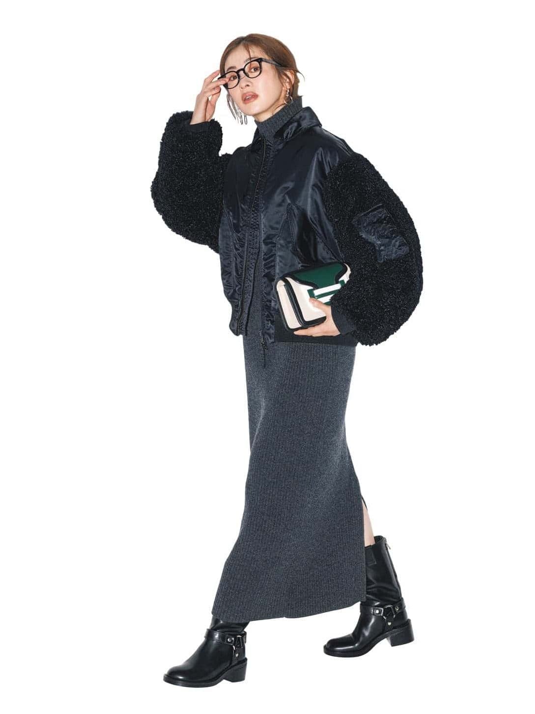 バッグ¥157,300(ピエール アルディ/ピエール アルディ 東京)ブルゾン¥94,600(ハイク/ボウルズ)ワンピース¥53,900(サクラ/インターリブ)ブーツ¥79,200(PIPPICHIC/ベイジュ)メガネ¥42,900(プロポ/プロポデザイン)ピアス¥30,800(ブランイリス/ブランイリス トーキョー)