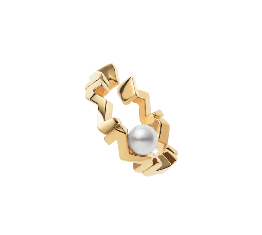 “M”の文字を幾何学的にデザインしたイエローゴールド台に、ベビーパールがセッティングされたイヤーカフ。イエローゴールドとパールの異なる質感が互いの美しさと輝きを引き出し合い、耳もとで程よい存在感を放ちます。ゴールドやパールのピアスと合わせたり……と、自在なアレンジを楽しんで。