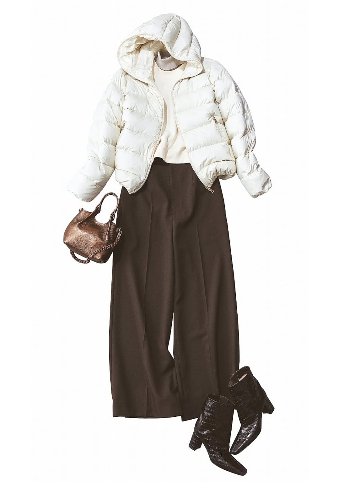 ホワイトダウンジャケット¥140,800(デュベティカ/F.E.N.)クロップドスウェット¥25,300(ハイク/ボウルズ)タートルネックニット¥25,300(アウディーレ)パンツ¥29,700(styling//styling/ ルミネ新宿1店)バッグ¥40,700チェーンストラップ¥9,900(ともにジャンニ キアリーニ/ジャンニ キアリーニ 銀座店)ブーツ¥89,100(ネブローニ)