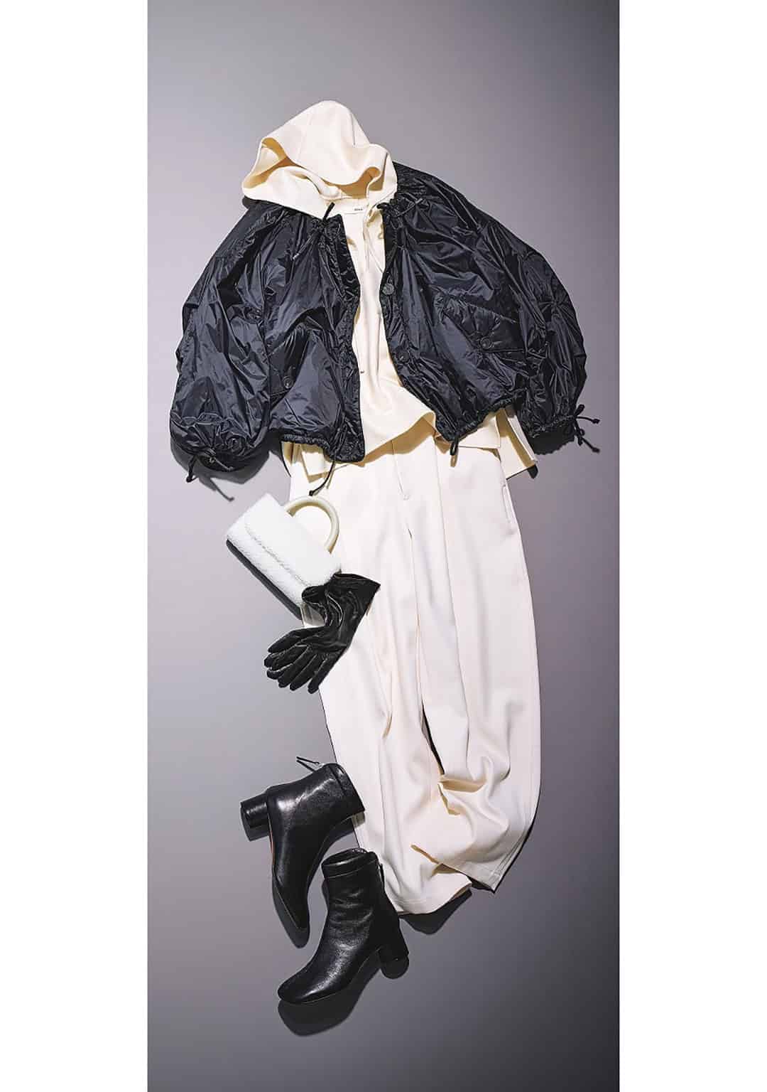 白パンツ×黒のショート丈アウターで淡色コーデにクールさをひとさじ。足元の黒ショートブーツが全体をキリッと締め、ぼんやり見えを回避。ラフな組み合わせでも、ブーツのおかげで一気にお出かけ仕様に整います。