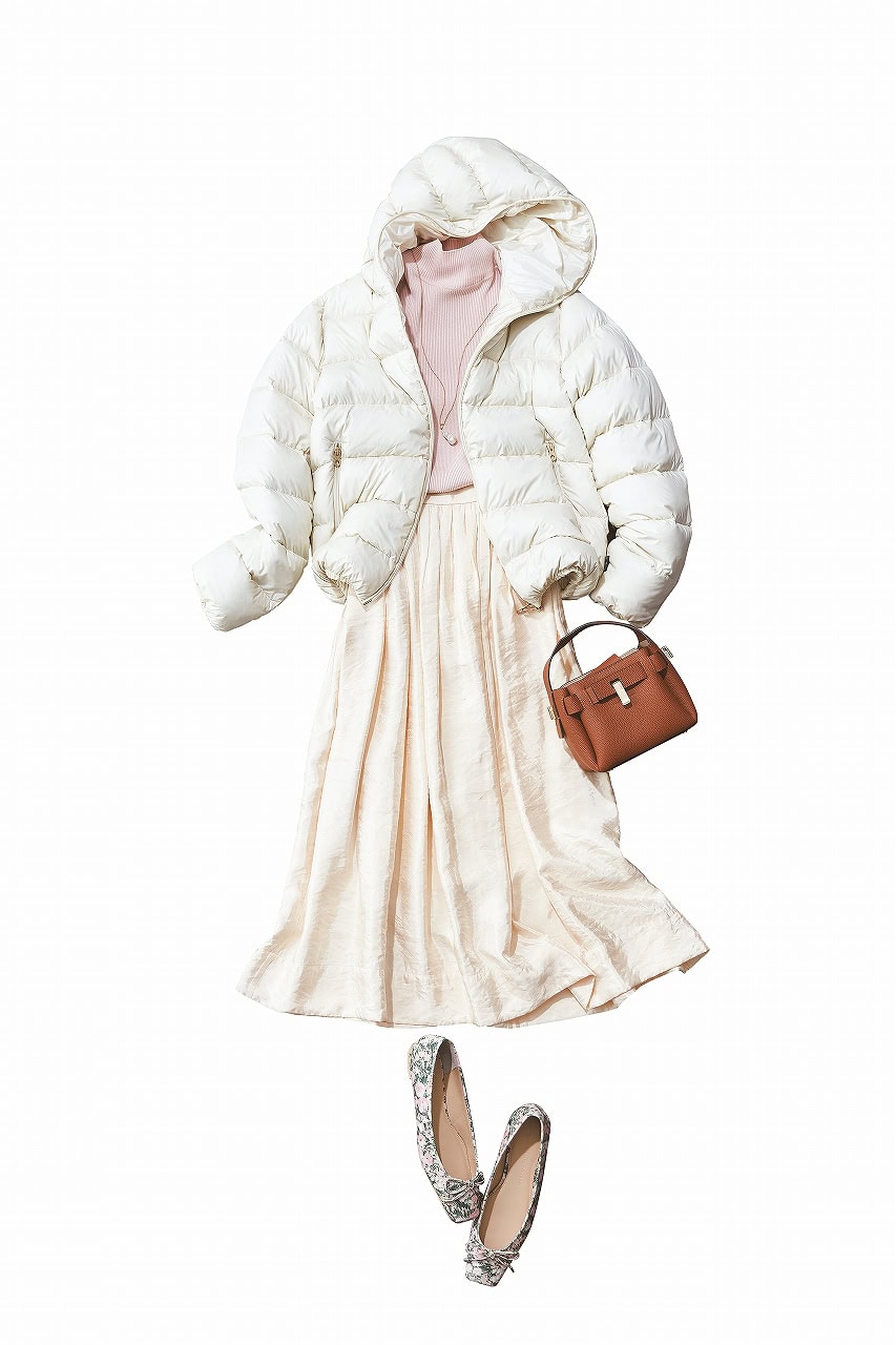 ホワイトダウンジャケット¥140,800(デュベティカ/F.E.N.)ピンクハイネックニット¥8,800(SNIDEL/SNIDEL ルミネ新宿2店)スカート¥27,500(マリリンムーン/マリリンムーンオンラインストア)バッグ¥42,900(PUNTI./エルディスト ショールーム)パンプス¥27,500(ツル バイ マリコ オイカワ)ネックレス¥28,600(インツーデザイン/ZUTTOHOLIC)