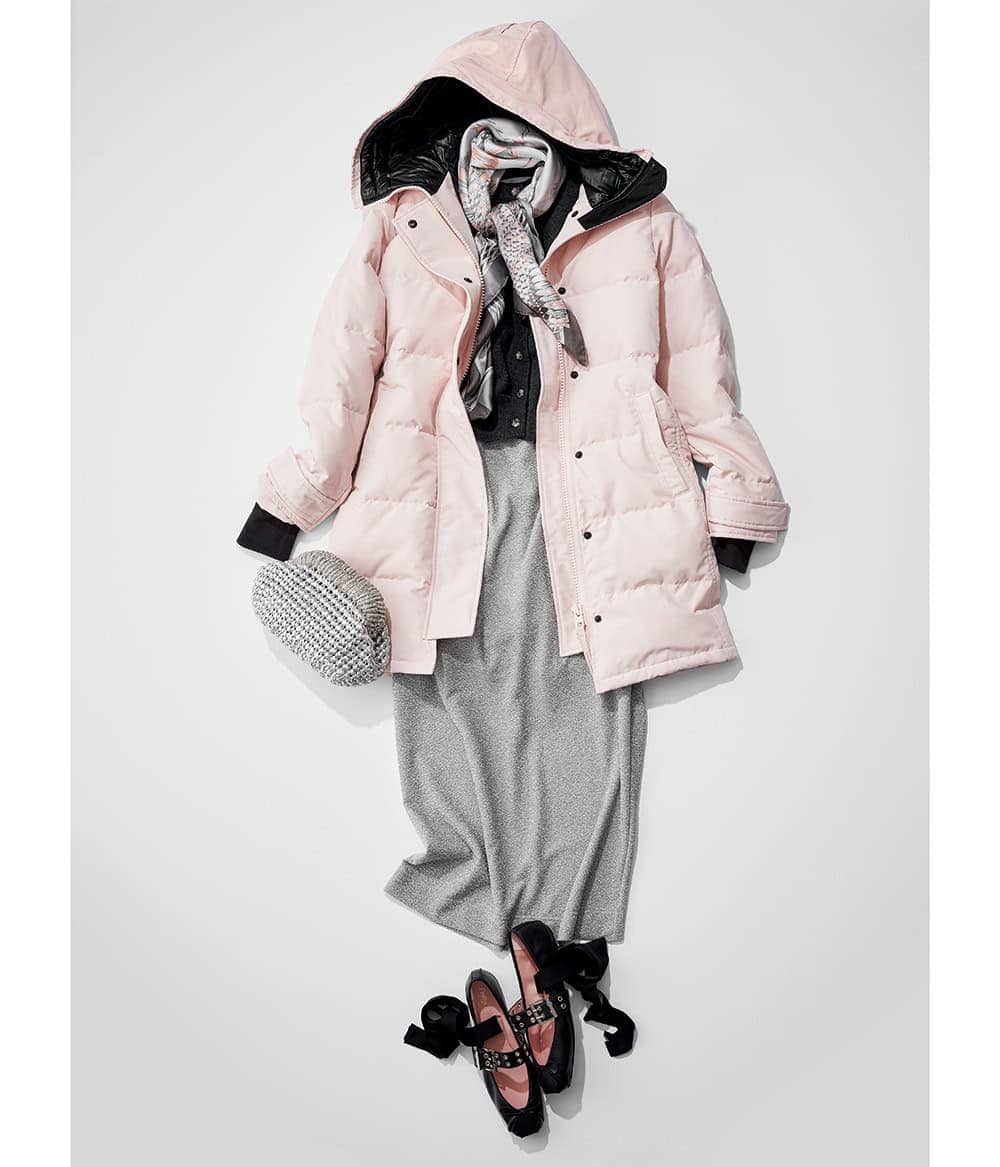 ピンクダウンコート¥242,000(カナダグース/カナダグースジャパン)ニット¥57,200(LOWER/ショールーム セッション)ラメスカート¥15,950(ジネス/ジオン商事)スカーフ¥22,000(マニプリ)バッグ¥55,000(ノアム ハザン/ティースクエア プレスルーム)シューズ¥60,500(プリティ・バレリーナ/F.E.N.)