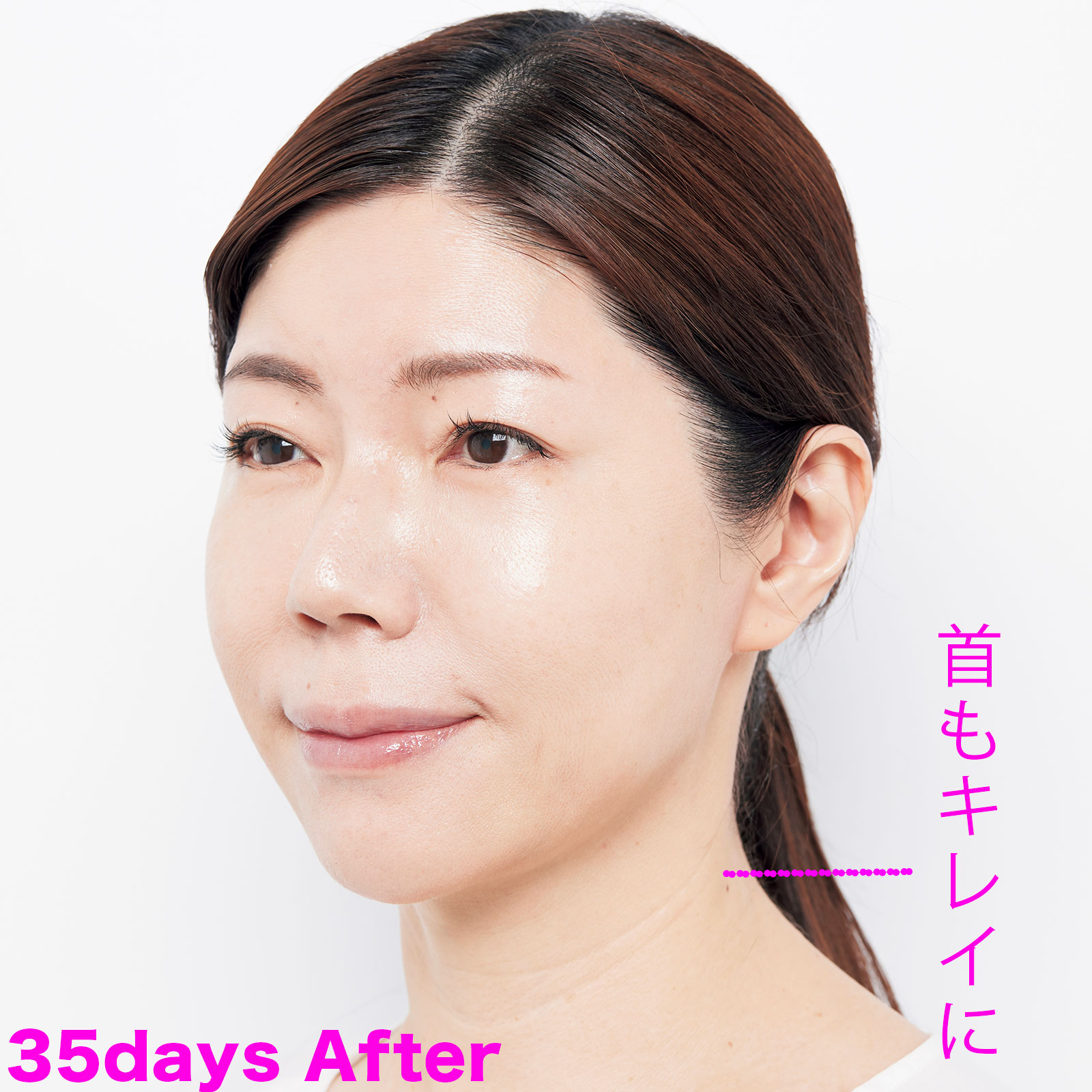 使い始めてすぐに肌の調子が安定したのを実感。2週間で頰や額中心にハリ感がアップ。35日間たっぷり使用で手触りがもっちりしてツヤがプラス。肌のトラブルがなくなって夕方も落ちないご機嫌な肌に。