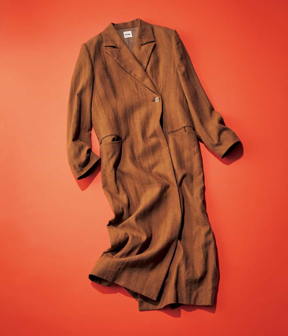 リネンコットン素材と、絶妙な色が気に入りました。コートほど重くなく、ジャケット感覚で着られるので、Tシャツ×デニムに羽織りたいです。