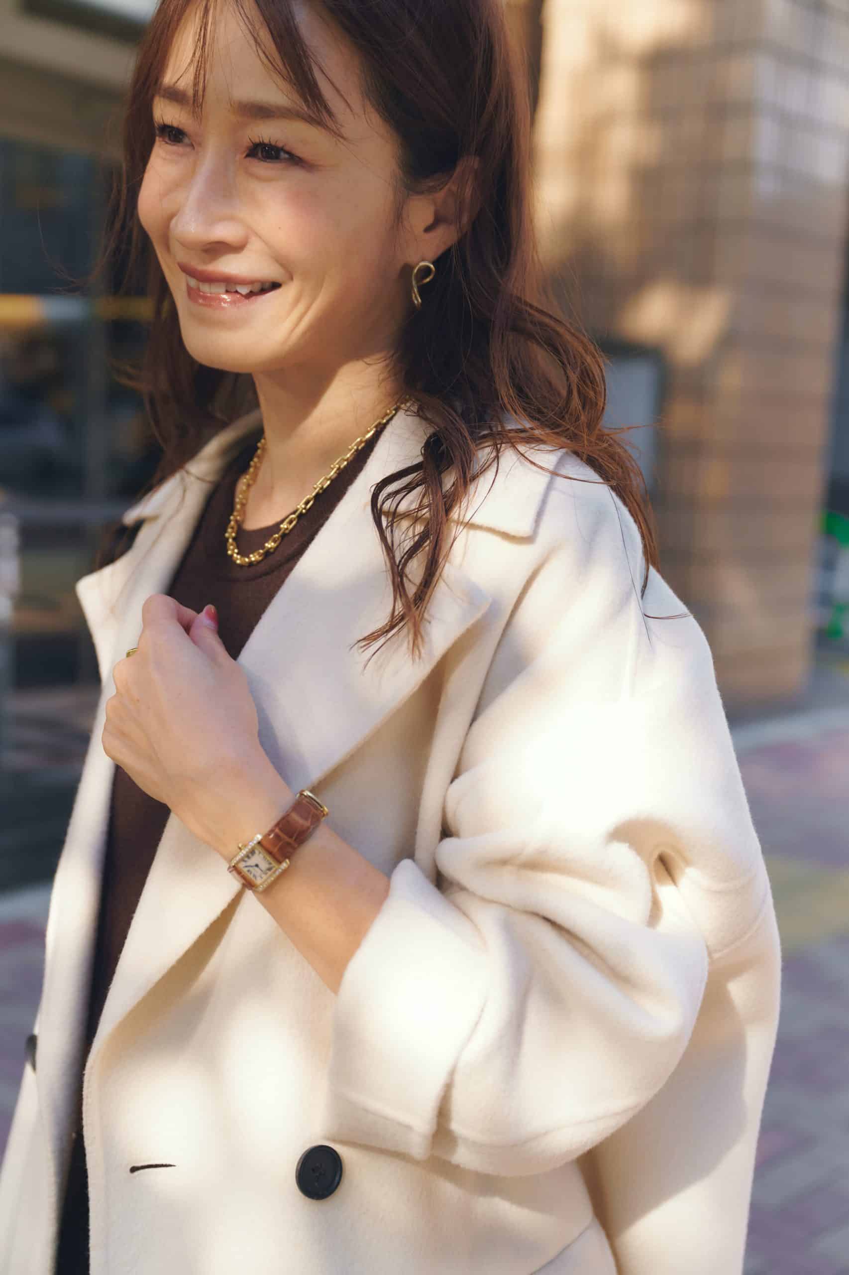 一昨年に購入したウールのロングコートは、トレンチ風のデザインと黒ボタンがアクセントになってくれて、シンプルすぎずマニッシュな雰囲気が気に入っています。去年まではスカート合わせの甘めスタイルが定番でしたが、今年はメンズライクなワイドパンツと合わせるのが気分です。トレンドのブラウンニット×ゴールドジュエリーで女性らしい温度感をプラスして、大人のマニッシュコーデに仕上げました。
