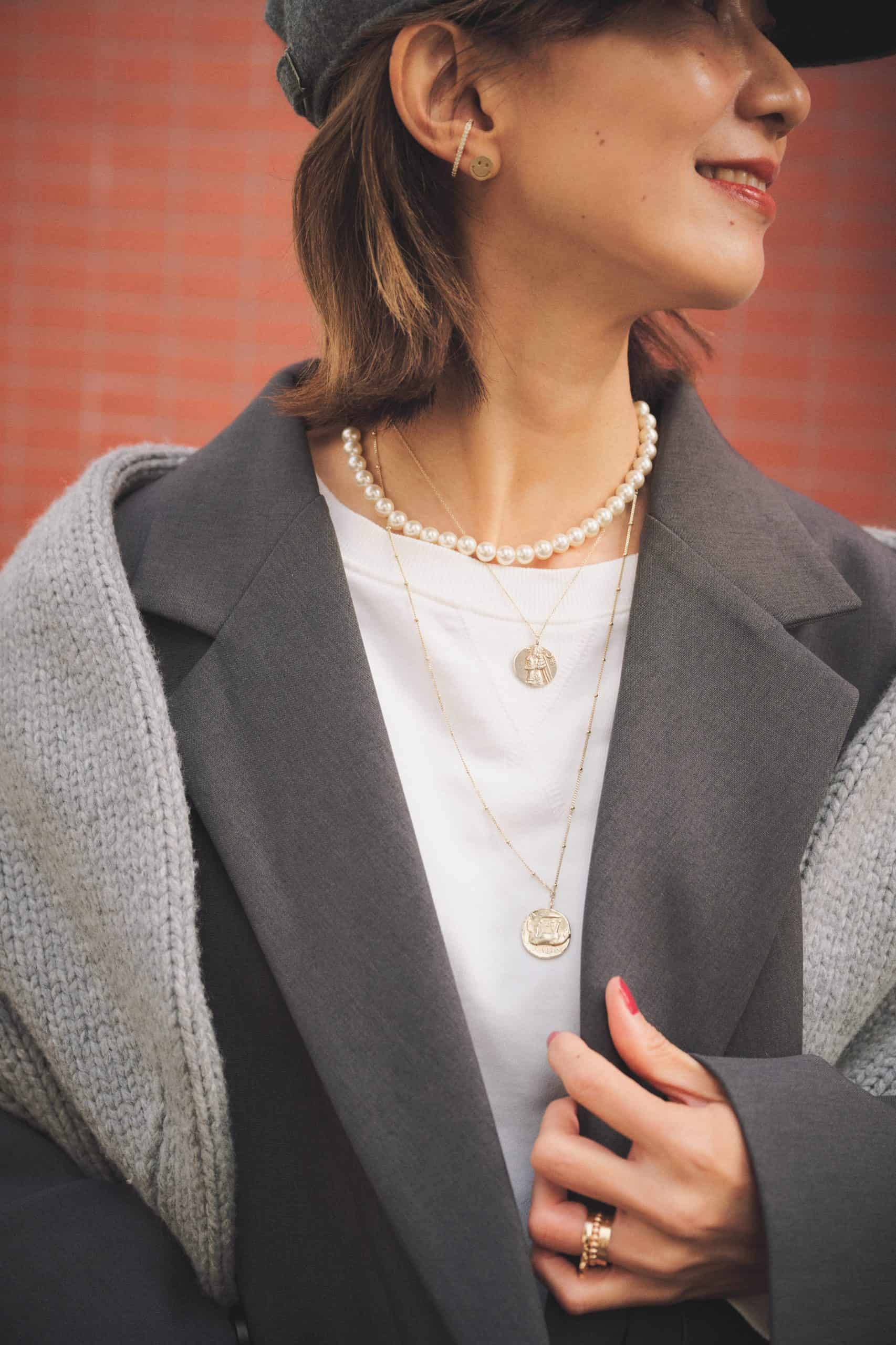 今年はコート感覚で羽織れるジャケットを新調。肩パットが入ったオーバーサイズのシルエットが魅力です。今季トレンドのショート丈のバイカーパンツを合わせ、肩に掛けたセーターで立体感をプラス。秋冬らしさを意識して、ジュエリーやバッグのチェーンはゴールドで統一しました。グレートーンで仕上げるきれいめカジュアルが今の気分です。